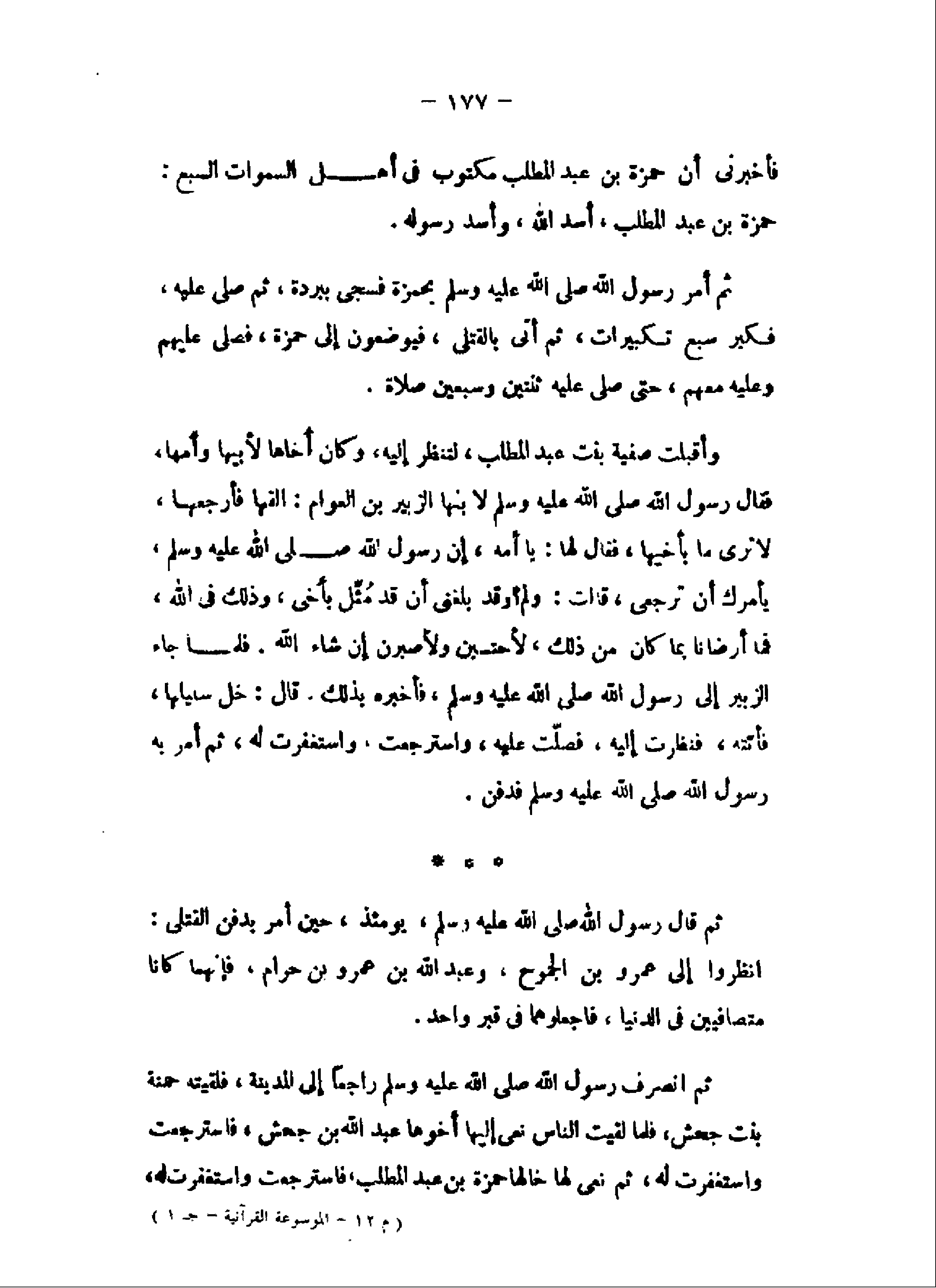 وأقبلت صفية بنت عبد المطلب، لتنظر إليه، وكان أخاها لأبيها وأمها، فقال رسول الله صلى الله عليه وسلم لا بنها الزبير بن العوام: القها فأرجعها، لا ترى ما بأخيها، فقال لها: يا أمه، إن رسول الله صلى الله عليه وسلم، يأمرك أن ترجعى، قالت: ولم؟ وقد بلغنى أن قد مثّل بأخى، وذلك فى الله، فما أرضانا بما كان من ذلك، لأحتسبن ولأصبرن إن شاء الله. فلما جاء الزبير إلى رسول الله صلى الله عليه وسلم، فأخبره بذلك. قال: خل سبيلها، فأتته، فنظرت إليه، فصلّت عليه، واسترجعت، واستغفرت له، ثم أمر به رسول الله صلى الله عليه وسلم فدفن.