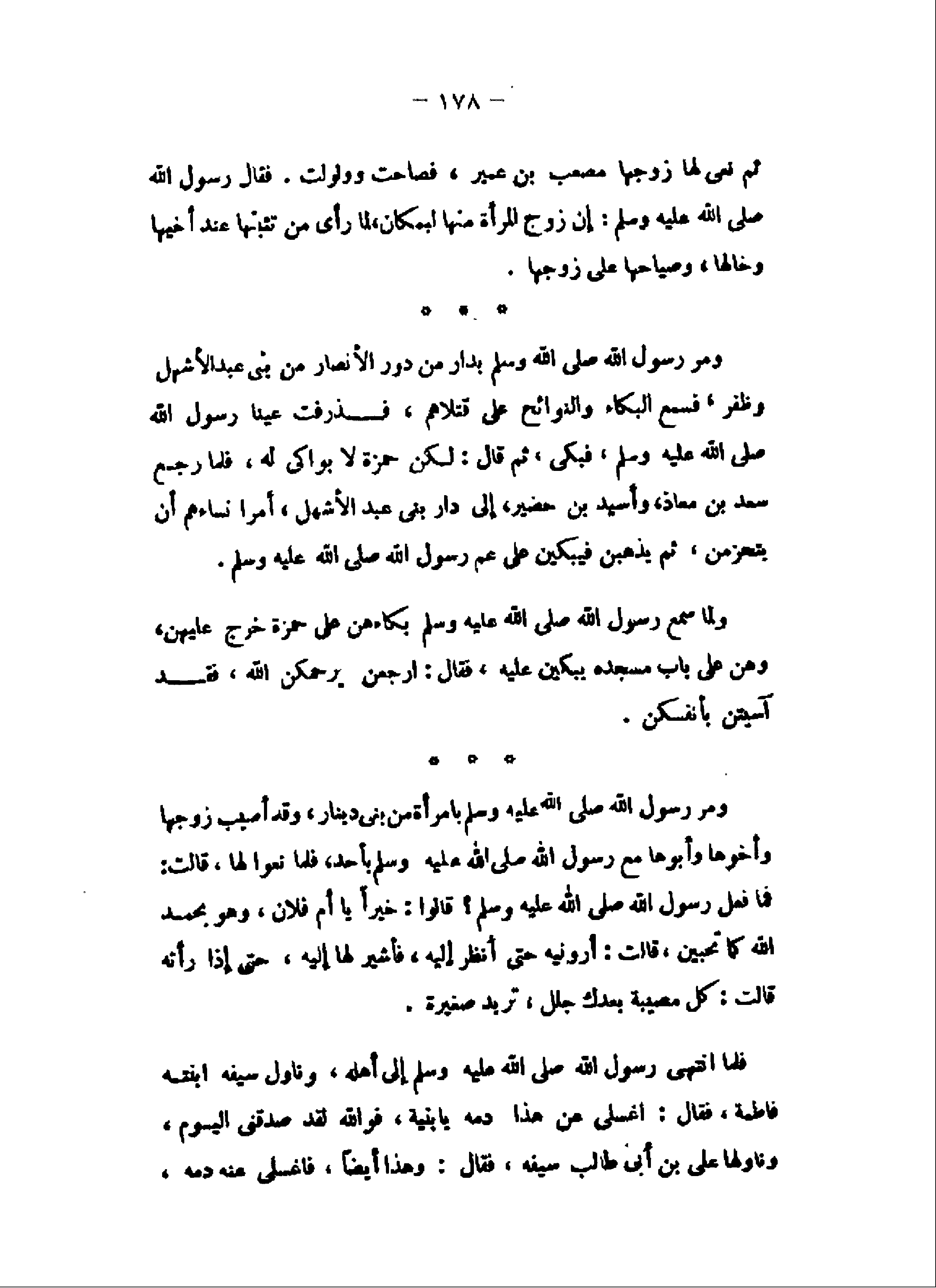 ومر رسول الله صلى الله عليه وسلم بدار من دور الأنصار من بنى عبد الأشهل وظفر، فسمع البكاء والنوائح على قتلاهم، فذرفت عينا رسول الله صلى الله عليه وسلم، فبكى، ثم قال: لكن حمزة لا بواكى له، فلما رجع سعد بن معاذ، وأسيد بن حضير، إلى دار بنى عبد الأشهل، أمرا نساءهم أن يتحزمن، ثم يذهبن فيبكين على عم رسول الله صلى الله عليه وسلم.