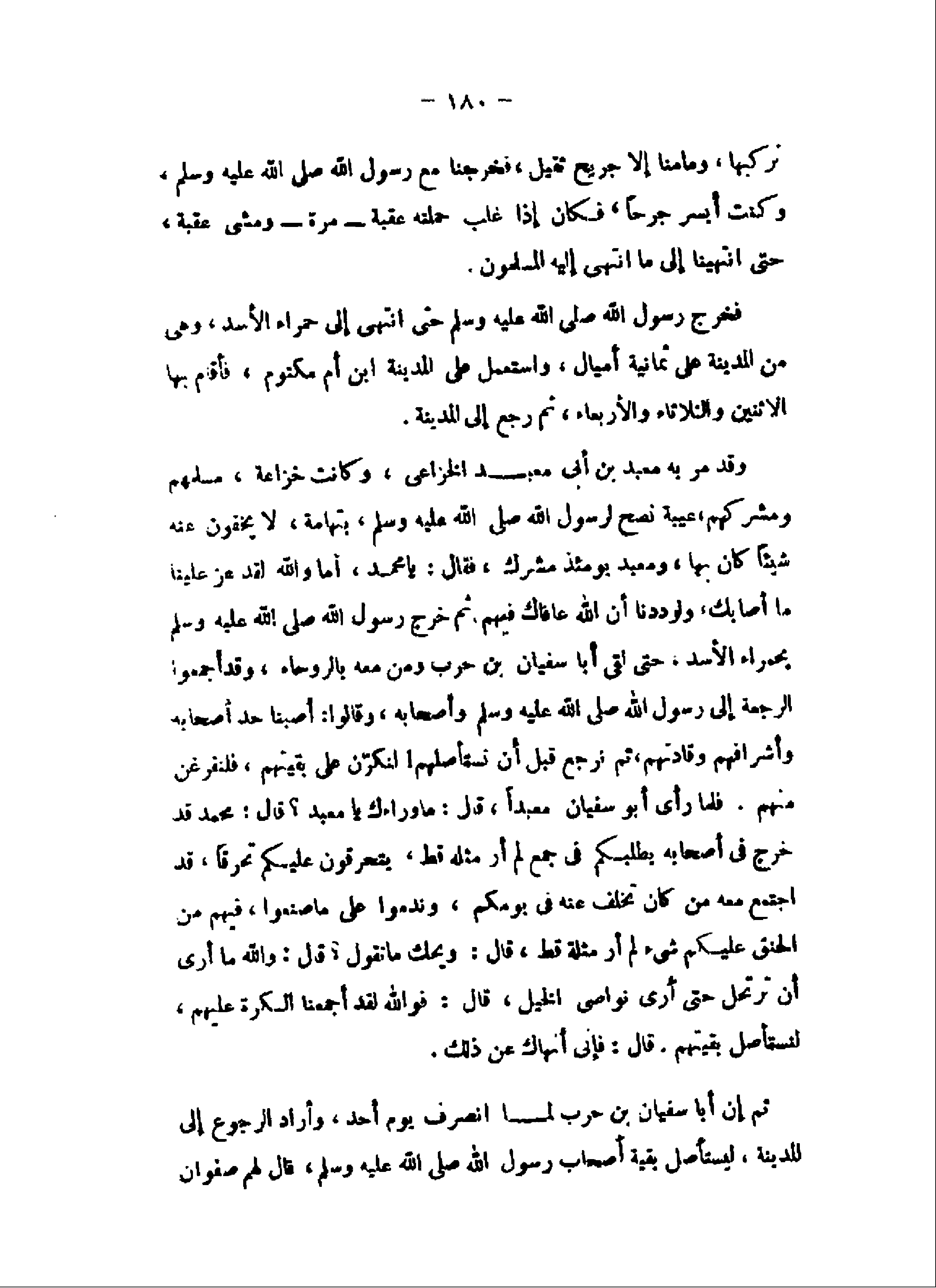 وقد مر به معبد بن أبى معبد الخزاعى، وكانت خزاعة، مسلمهم ومشركهم، عيبة نصح لرسول الله صلى الله عليه وسلم، بتهامة، لا يخفون عنه شيئا كان بها، ومعبد يومئذ مشرك، فقال: يا محمد، أما والله لقد عز علينا ما أصابك، ولوددنا أن الله عافاك فيهم، ثم خرج رسول الله صلى الله عليه وسلم بحمراء الأسد، حتى لقى أبا سفيان بن حرب ومن معه بالروحاء، وقد أجمعوا الرجعة إلى رسول الله صلى الله عليه وسلم وأصحابه، وقالوا: أصبنا حد أصحابه وأشرافهم وقادتهم، ثم نرجع قبل أن نستأصلهم! لنكرّن على بقيتهم، فلنقرغن منهم. فلما رأى أبو سفيان معبدا، قال: ما وراءك يا معبد؟ قال: محمد قد خرج فى أصحابه يطلبكم فى جمع لم أر مثله قط، يتحرقون عليكم تحرقا، قد اجتمع معه من كان تخلف عنه فى يومكم، وندموا على ما صنعوا، فيهم من الحنق عليكم شىء لم أر مثلة قط، قال: ويحك ما تقول؟ قال: والله ما أرى أن ترتحل حتى أرى نواصى الخيل، قال: فو الله لقد أجمعنا الكرة عليهم، لنستأصل بقيتهم. قال: فإنى أنهاك عن ذلك.