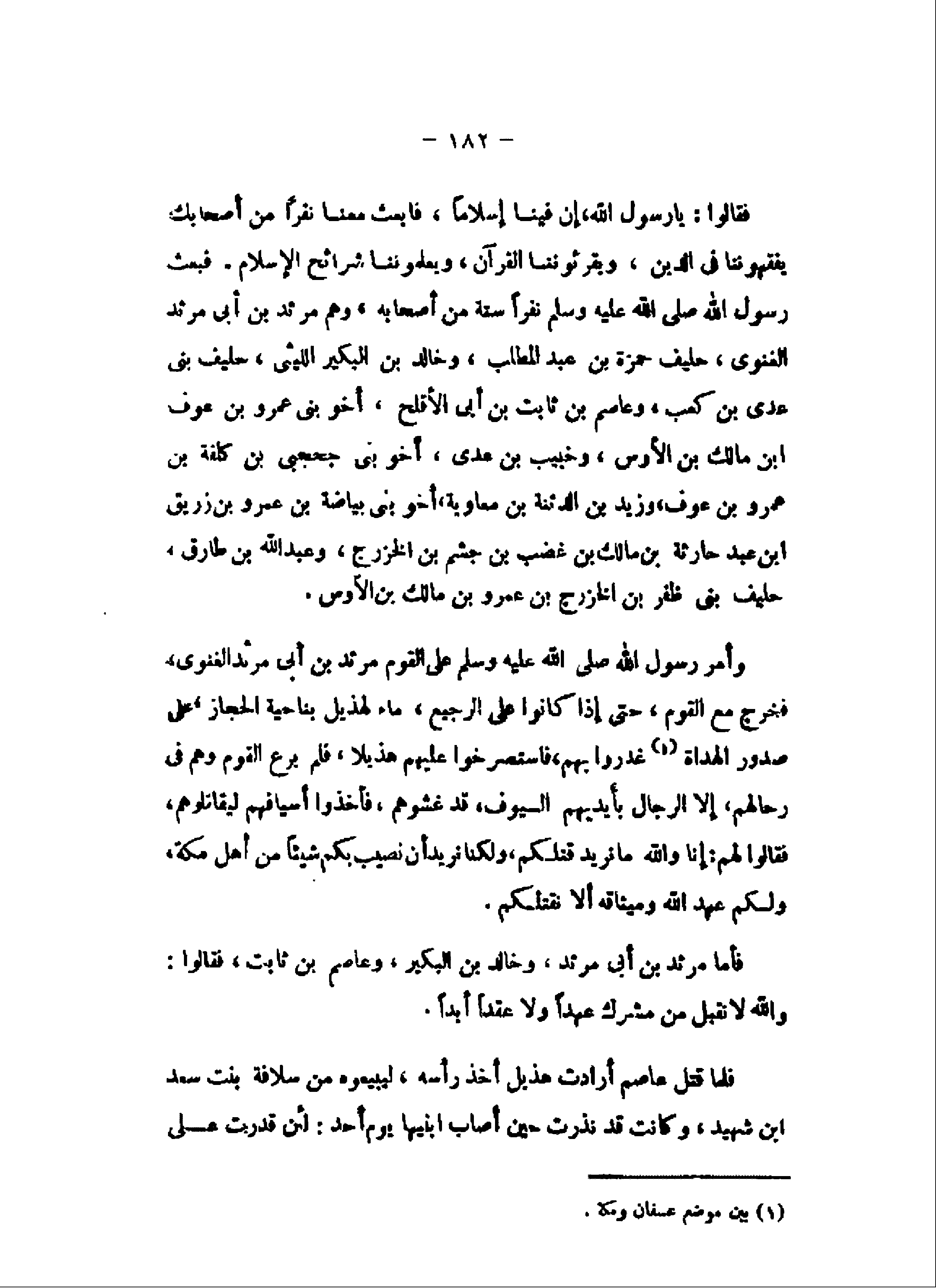 فقالوا: يا رسول الله، إن فينا إسلاما، فابعث معنا نقرا من أصحابك يفقهوننا فى الدين، ويقرئوننا القرآن، ويعلموننا شرائح الإسلام. فبعث رسول الله صلّى الله عليه وسلم نفرا ستة من أصحابه، وهم مرثد بن أبى مرثد الغنوى، حليف حمزة بن عبد المطلب، وخالد بن البكير الليثى، حليف بنى عدى بن كعب، وعاصم بن ثابت بن أبى الأقلح، أخو بنى عمرو بن عوف ابن مالك بن الأوس، وخبيب بن عدى، أخو بنى جحجبى بن كلفة بن عمرو بن عوف، وزيد بن الدثنة بن معاوية، أخو بنى بياضة بن عمرو بن زريق ابن عبد حارثة بن مالك بن غضب بن جشم بن الخزرج، وعبد الله بن طارق، حليف بنى ظفر بن الخزرج بن عمرو بن مالك بن الأوس.