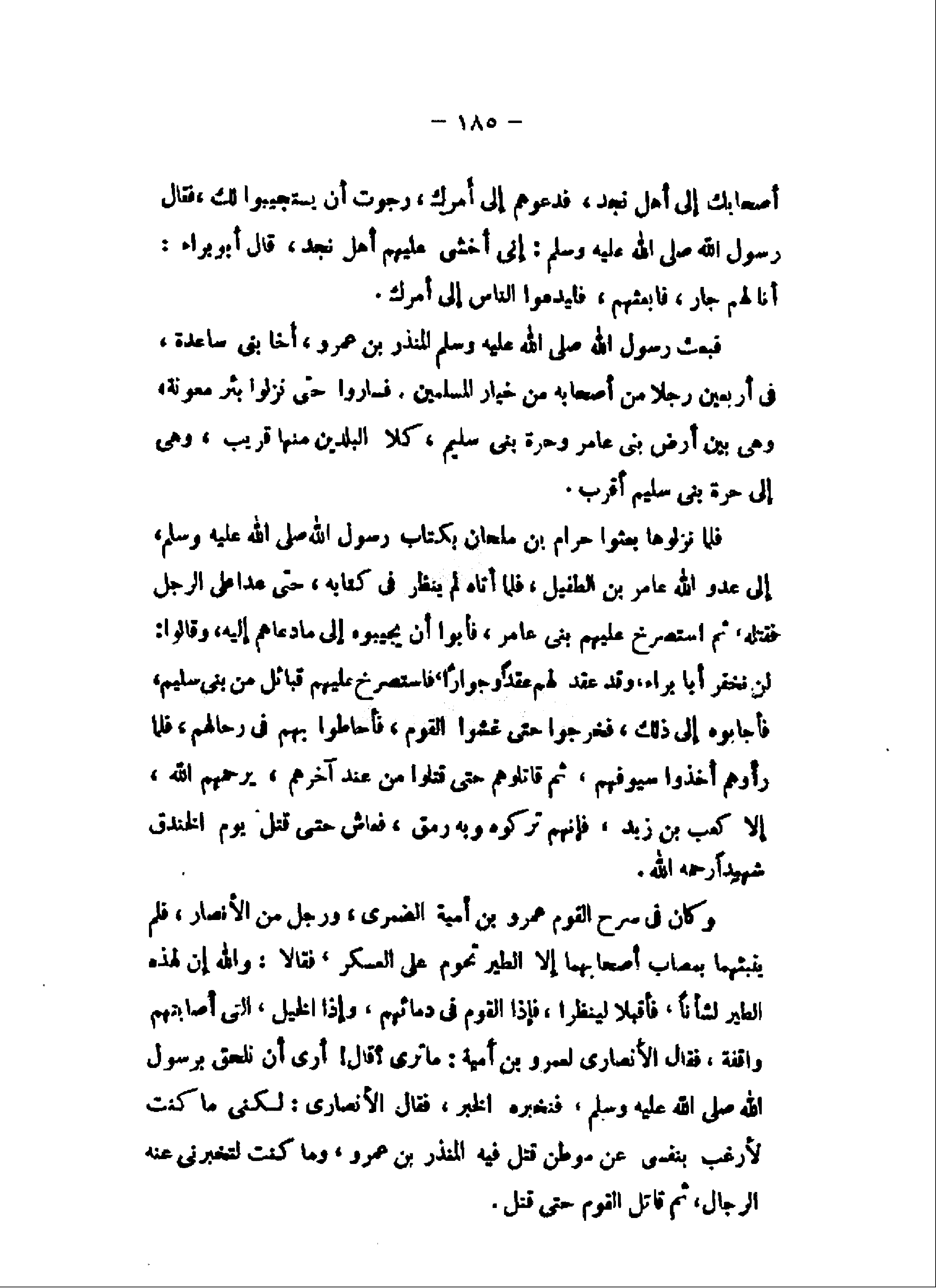 لن نخفر أبا براء، وقد عقد لهم عقدا وجوارا، فاستصرخ عليهم قبائل من بنى سليم، فأجابوه إلى ذلك، فخرجوا حتى غشوا القوم، فأحاطوا بهم فى رحالهم، فلما رأوهم أخذوا سيوفهم، ثم قاتلوهم حتى قتلوا من عند آخرهم، يرحمهم الله، إلا كعب بن زيد، فإنهم تركوه وبه رمق، فعاش حتى قتل يوم الخندق شهيدا رحمه الله.
