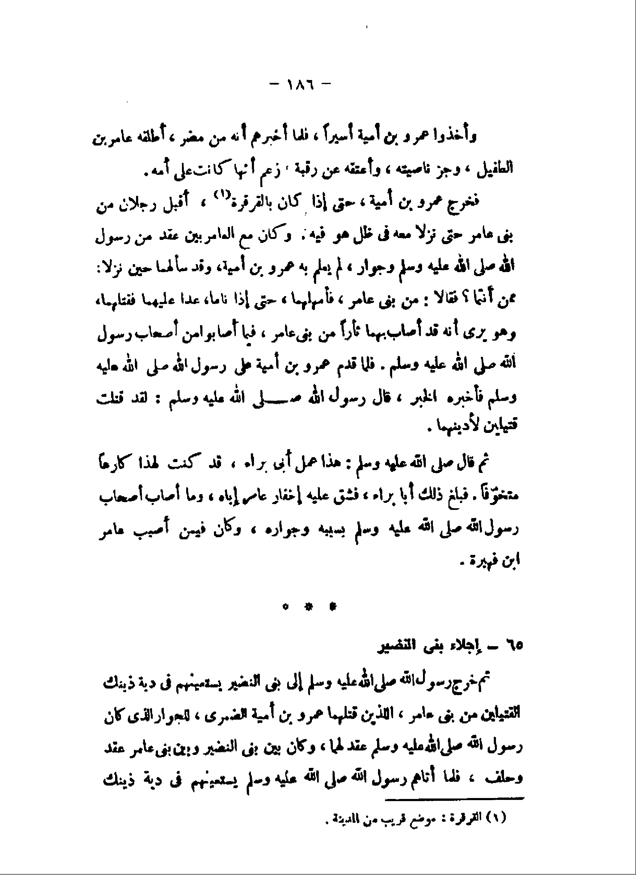 ممن أنتما؟ فقالا: من بنى عامر، فأمهلهما، حتى إذا ناما، عدا عليهما فقتلهما، وهو يرى أنه قد أصاب بهما ثأرا من بنى عامر، فيما أصابوا من أصحاب رسول الله صلى الله عليه وسلم. فلما قدم عمرو بن أمية على رسول الله صلى الله عليه وسلم فأخبره الخبر، قال رسول الله صلى الله عليه وسلم: لقد قتلت قتيلين لأدينهما.