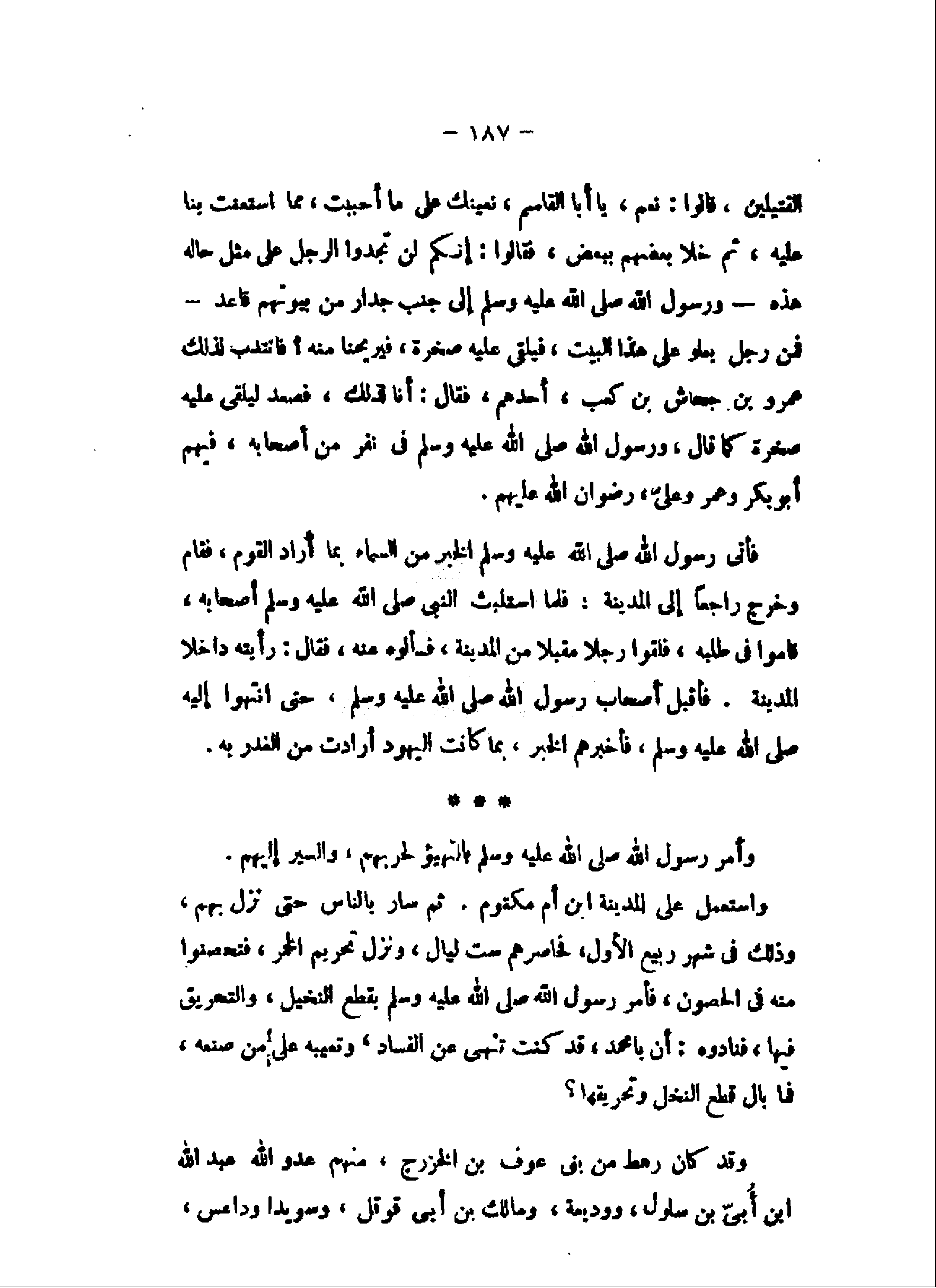فأتى رسول الله صلى الله عليه وسلم الخبر من السماء بما أراد القوم، فقام وخرج راجعا إلى المدينة، فلما استلبث النبى صلى الله عليه وسلم أصحابه، قاموا فى طلبه، فلقوا رجلا مقبلا من المدينة، فسألوه عنه، فقال: رأيته داخلا المدينة. فأقبل أصحاب رسول الله صلى الله عليه وسلم، حتى انتهوا إليه صلى الله عليه وسلم، فأخبرهم الخبر، بما كانت اليهود أرادت من الغدر به.