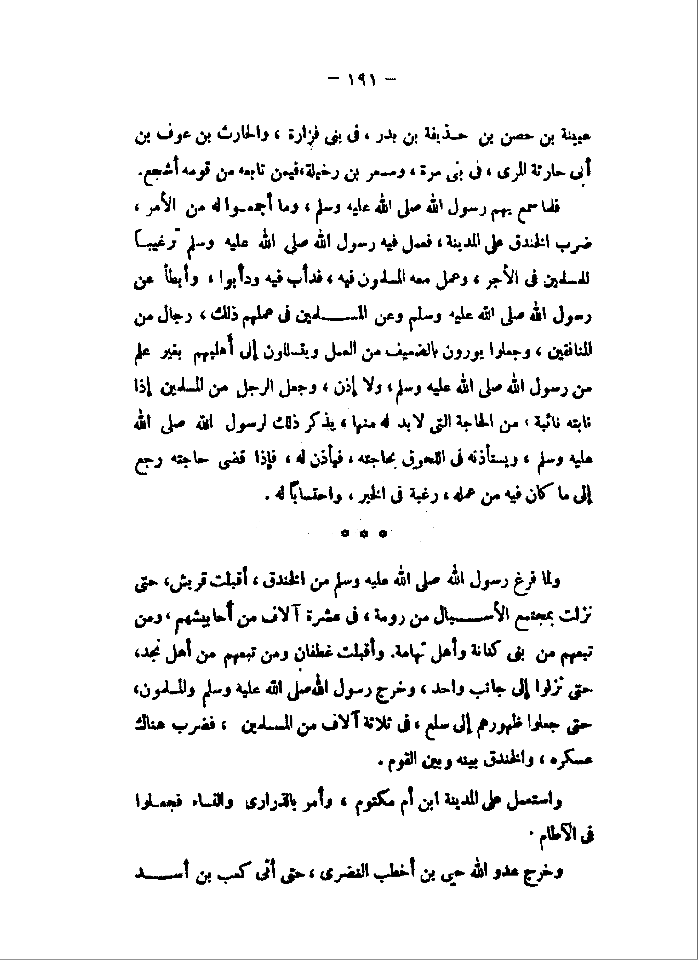 ولما فرغ رسول الله صلى الله عليه وسلم من الخندق، أقبلت قريش، حتى نزلت بمجتمع الأسيال من رومة، فى عشرة آلاف من أحابيشهم، ومن تبعهم من بنى كنانة وأهل تهامة. وأقبلت غطفان ومن تبعهم من أهل نجد، حتى نزلوا إلى جانب واحد، وخرج رسول الله صلى الله عليه وسلم والمسلمون، حتى جعلوا ظهورهم إلى سلع، فى ثلاثة آلاف من المسلمين، فضرب هناك عسكره، والخندق بينه وبين القوم.