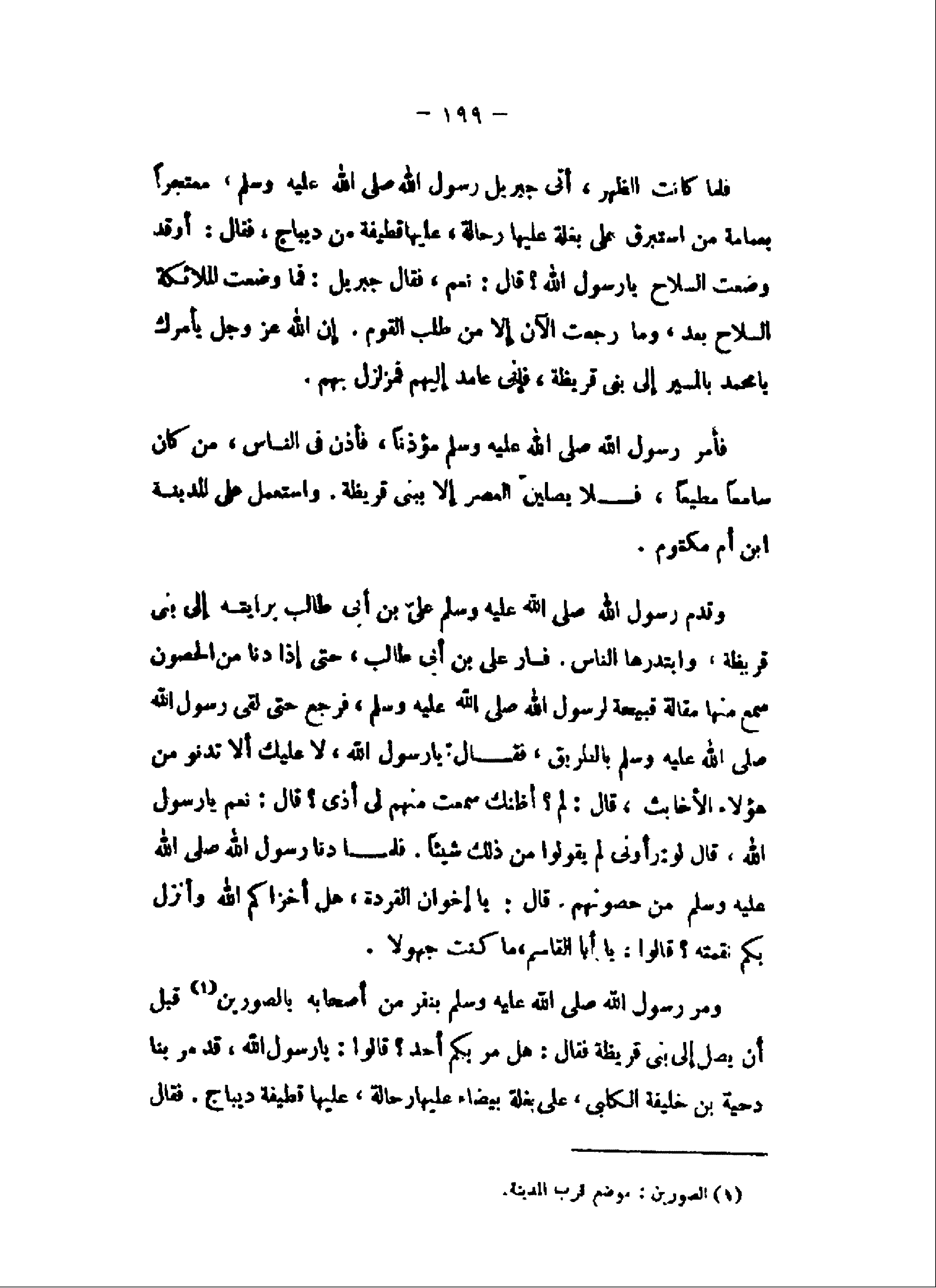 ومر رسول الله صلى الله عليه وسلم بنفر من أصحابه بالصورين «1» قبل أن يصل إلى بنى قريظة فقال: هل مر بكم أحد؟ قالوا: يا رسول الله، قد مر بنا دحية بن خليفة الكلبى، على بغلة بيضاء عليها رحالة، عليها قطيفة ديباج. فقال