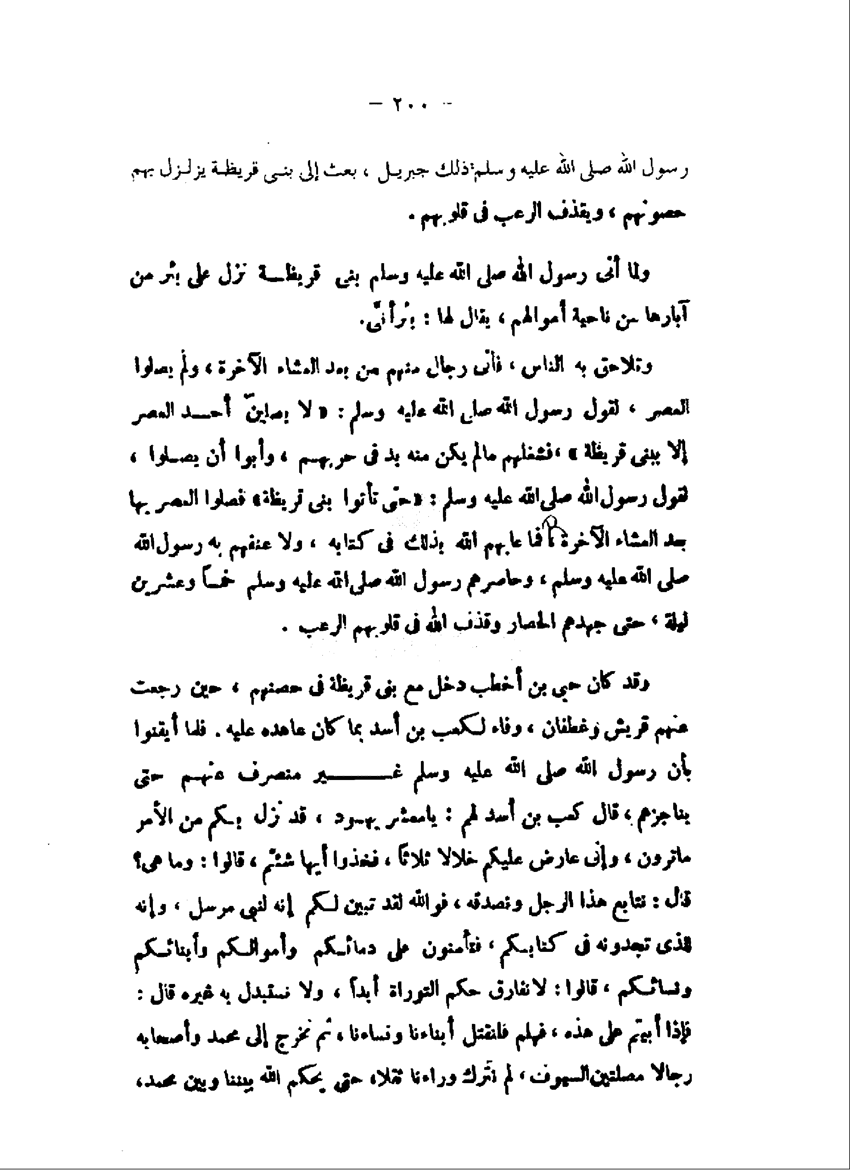 وتلاحق به الناس، فأتى رجال منهم من بعد العشاء الآخرة، ولم يصلوا العصر، لقول رسول الله صلى الله عليه وسلم: «لا يصلينّ أحد العصر إلا ببنى قريظة» ، فشغلهم ما لم يكن منه بد فى حربهم، وأبوا أن يصلوا، لقول رسول الله صلى الله عليه وسلم: «حتى تأتوا بنى قريظة» فصلوا العصر بها بعد العشاء الآخرة،
