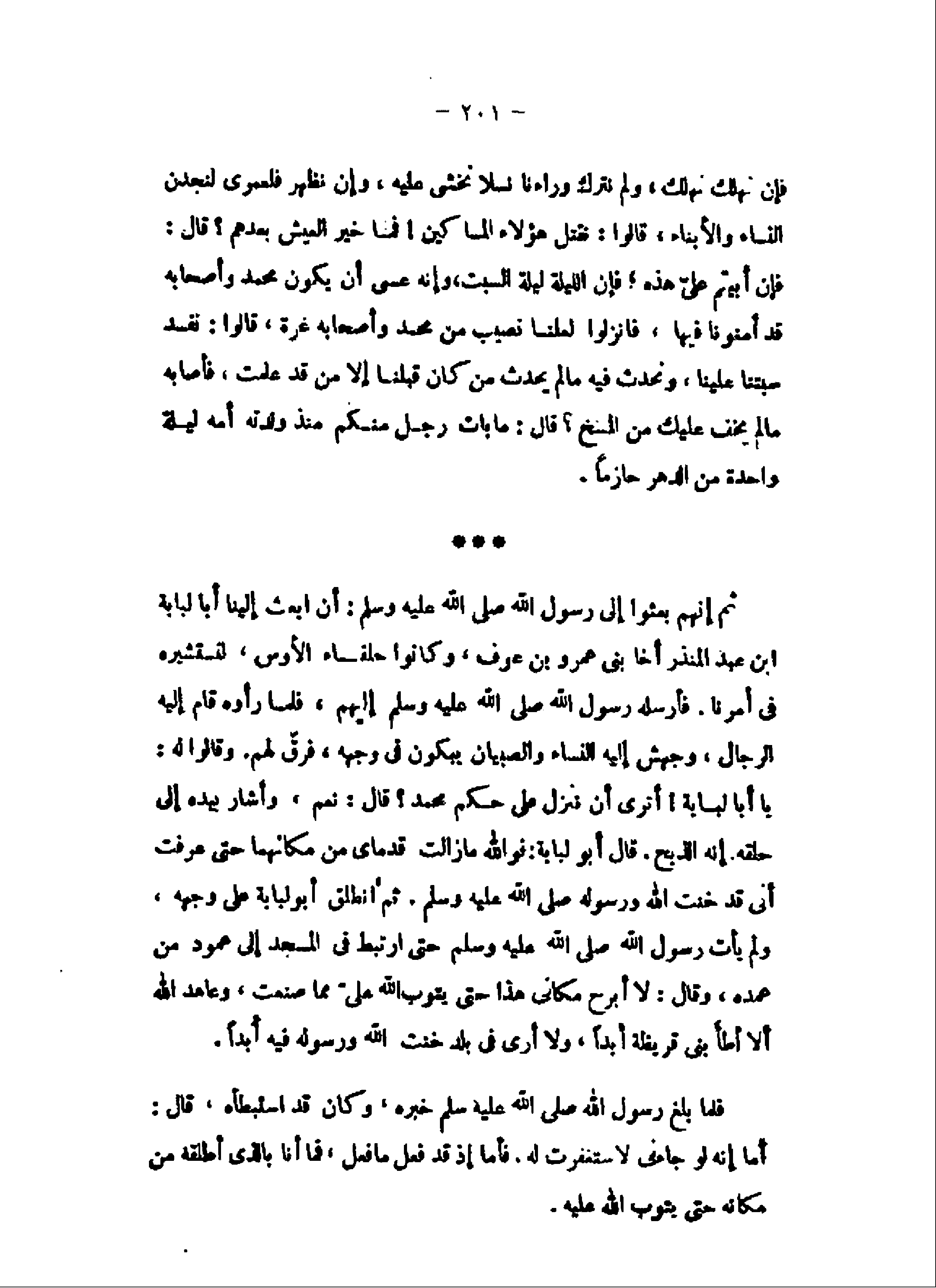 فإن أبيتم علىّ هذه، فإن الليلة ليلة السبت، وإنه عسى أن يكون محمد وأصحابه قد أمنونا فيها، فانزلوا لعلنا نصيب من محمد وأصحابه غرة، قالوا: نفسد سبتنا علينا، ونحدث فيه ما لم يحدث من كان قبلنا إلا من قد علمت، فأصابه ما لم يخف عليك من المسخ؟ قال: ما بات رجل منكم منذ ولدته أمه ليلة واحدة من الدهر حازما.