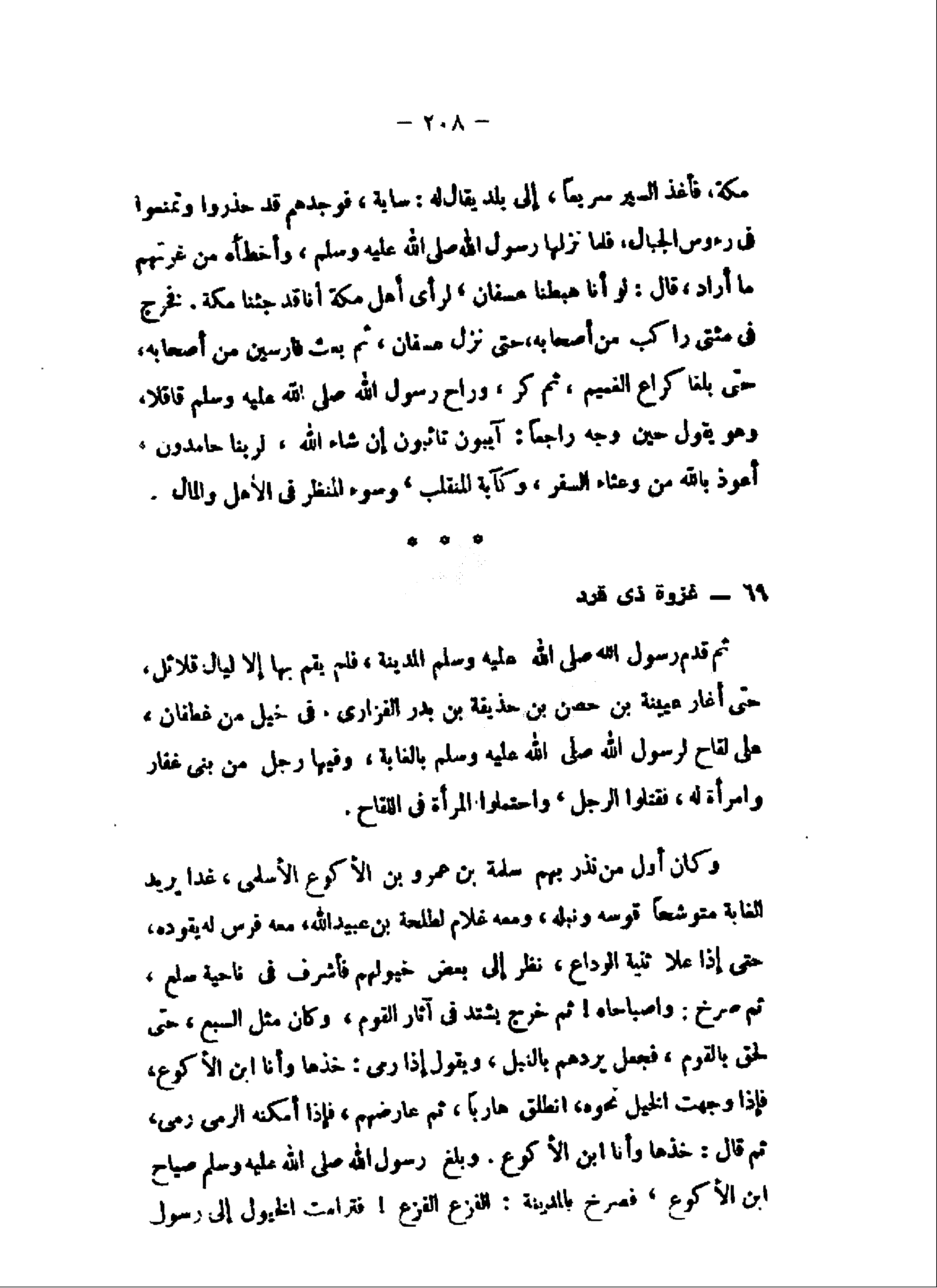 مكة، فأغذ السير سريعا، إلى بلد يقال له: ساية، فوجدهم قد حذروا وتمنعوا فى رءوس الجبال، فلما نزلها رسول الله صلى الله عليه وسلم، وأخطأه من غرتهم ما أراد، قال: لو أنا هبطنا عسفان، لرأى أهل مكة أنا قد جئنا مكة. فخرج فى مئتى راكب من أصحابه، حتى نزل عسفان، ثم بعث فارسين من أصحابه، حتى بلغا كراع الغميم، ثم كر،