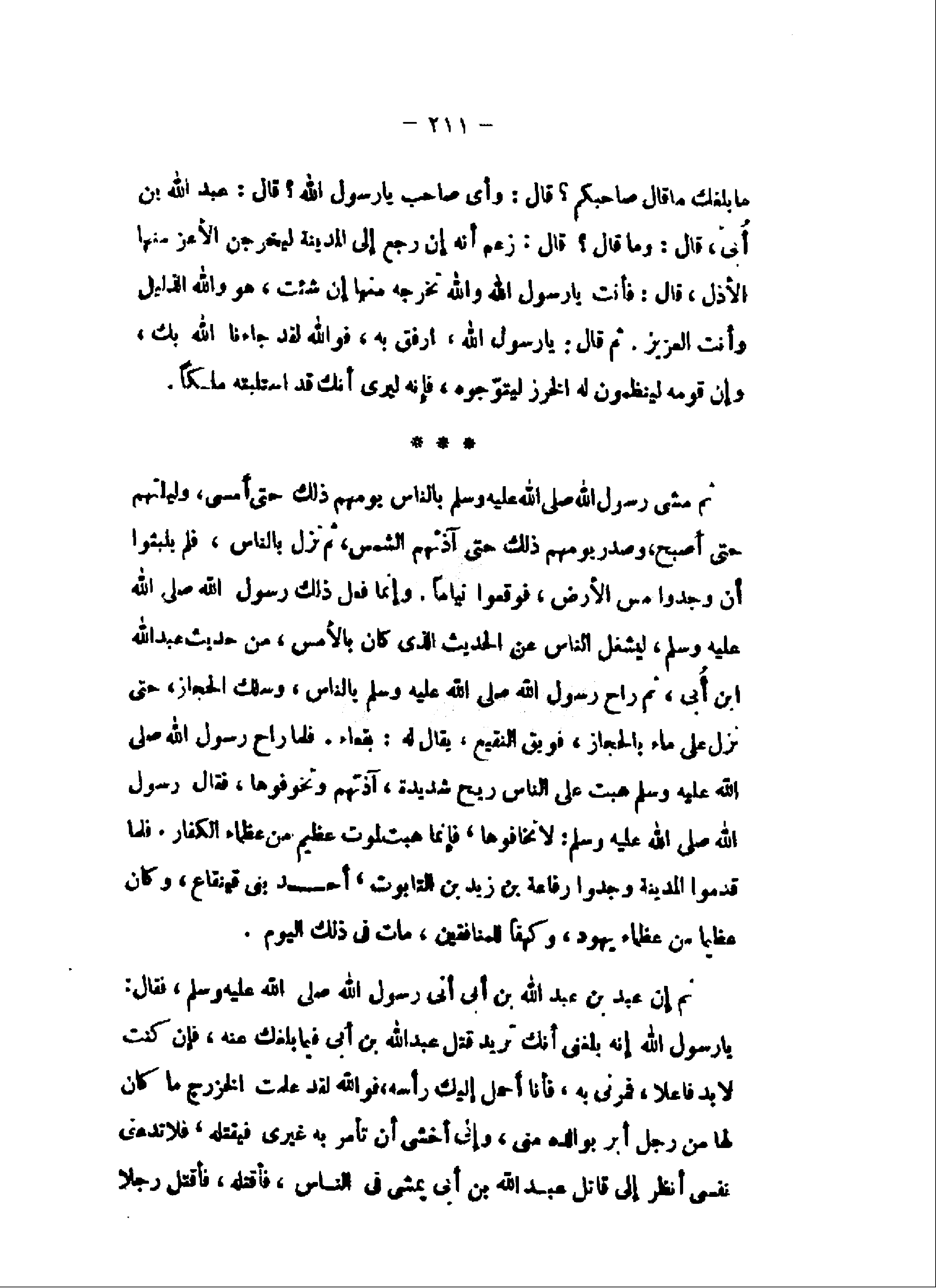 ثم مشى رسول الله صلى الله عليه وسلم بالناس يومهم ذلك حتى أمسى، وليلتهم حتى أصبح، وصدر يومهم ذلك حتى آذتهم الشمس، ثم نزل بالناس، فلم يلبثوا أن وجدوا مس الأرض، فوقعوا نياما. وإنما فعل ذلك رسول الله صلى الله عليه وسلم، ليشغل الناس عن الحديث الذى كان بالأمس، من حديث عبد الله ابن أبى، ثم راح رسول الله صلى الله عليه وسلم بالناس، وسلك الحجاز، حتى نزل على ماء بالحجاز، فويق النقيع، يقال له: بقعاء.