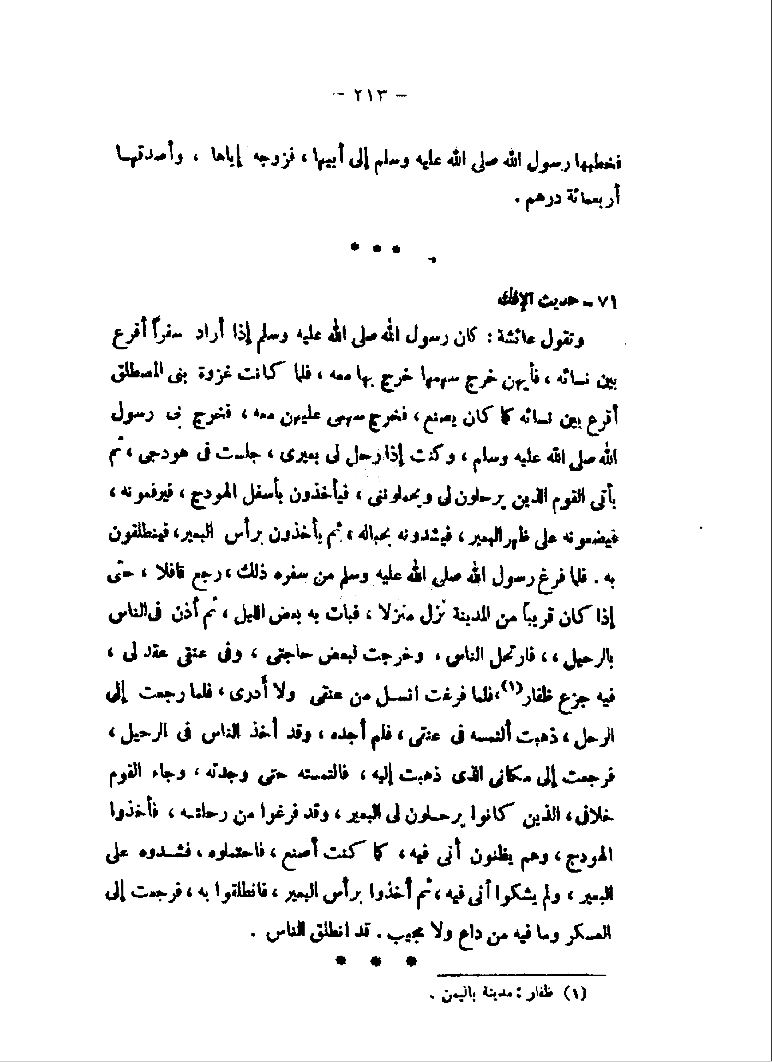 وتقول عائشة: كان رسول الله صلى الله عليه وسلم إذا أراد سفرا أقرع بين نسائه، فأيهن خرج سهمها خرج بها معه، فلما كانت غزوة بنى المصطلق أقرع بين نسائه كما كان يصنع، فخرج سهمى عليهن معه، فخرج بى رسول الله صلى الله عليه وسلم، وكنت إذا رحل لى بعيرى، جلست فى هودجى، ثم يأتى القوم الذين يرحلون لى ويحملوننى، فيأخذون بأسفل الهودج، فيرفعونه، فيضعونه على ظهر البعير، فيشدونه بحباله، ثم يأخذون برأس البعير، فينطلقون به. فلما فرغ رسول الله صلى الله عليه وسلم من سفره ذلك، رجع قافلا، حتى إذا كان قريبا من المدينة نزل منزلا، فبات به بعض الليل، ثم أذن فى الناس بالرحيل، فارتحل الناس، وخرجت لبعض حاجتى، وفى عنقى عقد لى، فيه جزع ظفار «1» ، فلما فرغت انسل من عنقى ولا أدرى، فلما رجعت إلى الرحل، ذهبت ألتمسه فى عنقى، فلم أجده، وقد أخذ الناس فى الرحيل، فرجعت إلى مكانى الذى ذهبت إليه، فالتمسته حتى وجدته، وجاء القوم خلافى، الذين كانوا يرحلون لى البعير، وقد فرغوا من رحلته، فأخذوا الهودج، وهم يظنون أنى فيه، كما كنت أصنع، فاحتملوه، فشدوه على البعير، ولم يشكوا أنى فيه، ثم أخذوا برأس البعير، فانطلقوا به، فرجعت إلى العسكر وما فيه من داع ولا مجيب. قد انطلق الناس.