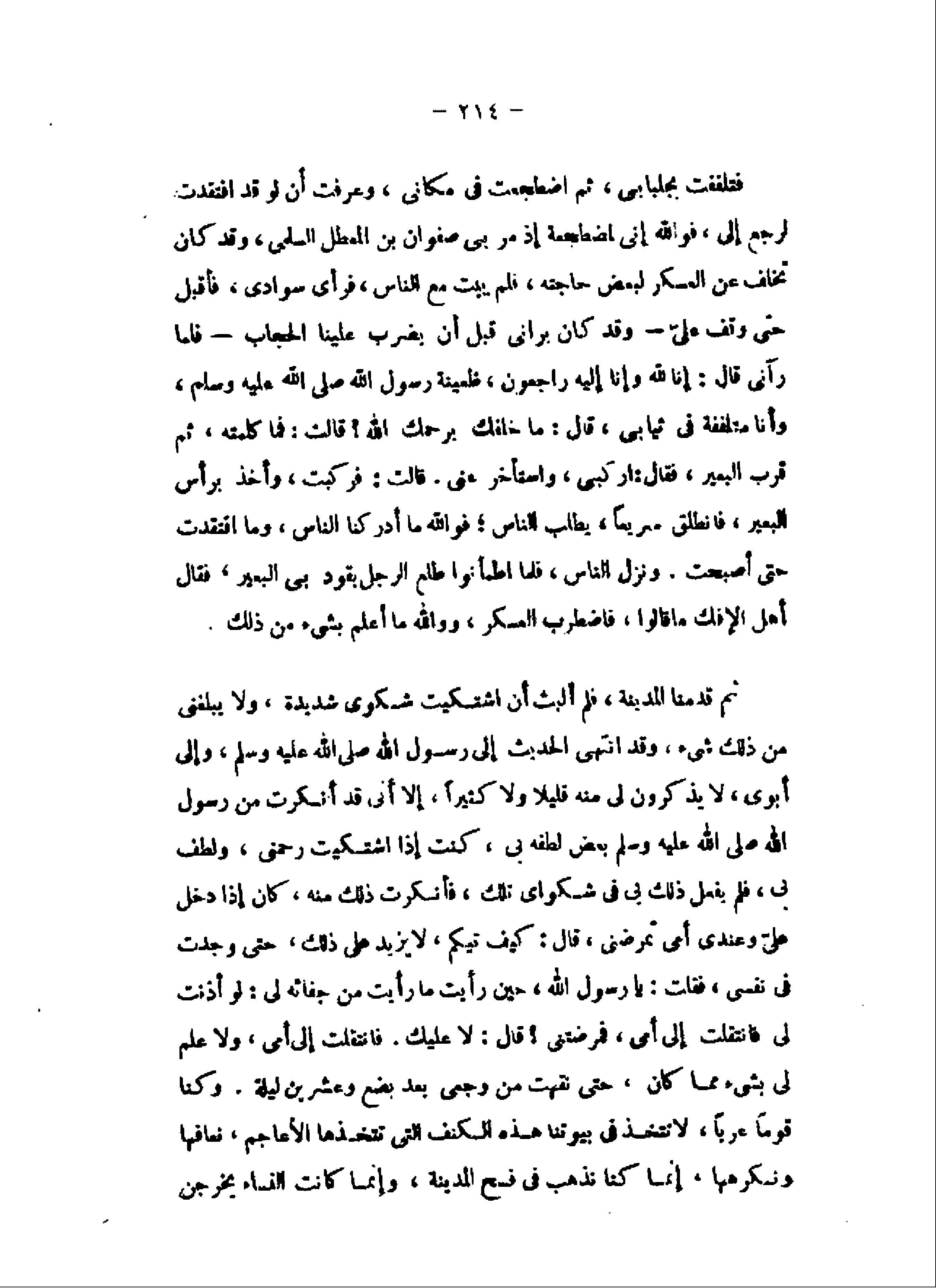 فتلففت بجلبابى، ثم اضطجعت فى مكانى، وعرفت أن لو قد افتقدت لرجع إلى، فو الله إنى لمضطجعة إذ مر بى صفوان بن المعطل السلمى، وقد كان تخلف عن العسكر لبعض حاجته، فلم يبت مع الناس، فرأى سوادى، فأقبل حتى وقف علىّ- وقد كان برانى قبل أن يضرب علينا الحجاب- فلما رآنى قال: إنا لله وإنا إليه راجعون، ظعينة رسول الله صلى الله عليه وسلم، وأنا متلففة فى ثيابى، قال: ما خلفك برحمك الله؟ قالت: فما كلمته، ثم قرب البعير، فقال: اركبى، واستأخر عنى. قالت: فركبت، وأخذ برأس البعير، فانطلق سريعا، يطلب الناس، فو الله ما أدركنا الناس، وما اقتقدت حتى أصبحت. ونزل الناس، فلما اطمأنوا طلع الرجل بقود بى البعير، فقال أهل الإفك ما قالوا، فاضطرب العسكر، ووالله ما أعلم بشىء من ذلك.