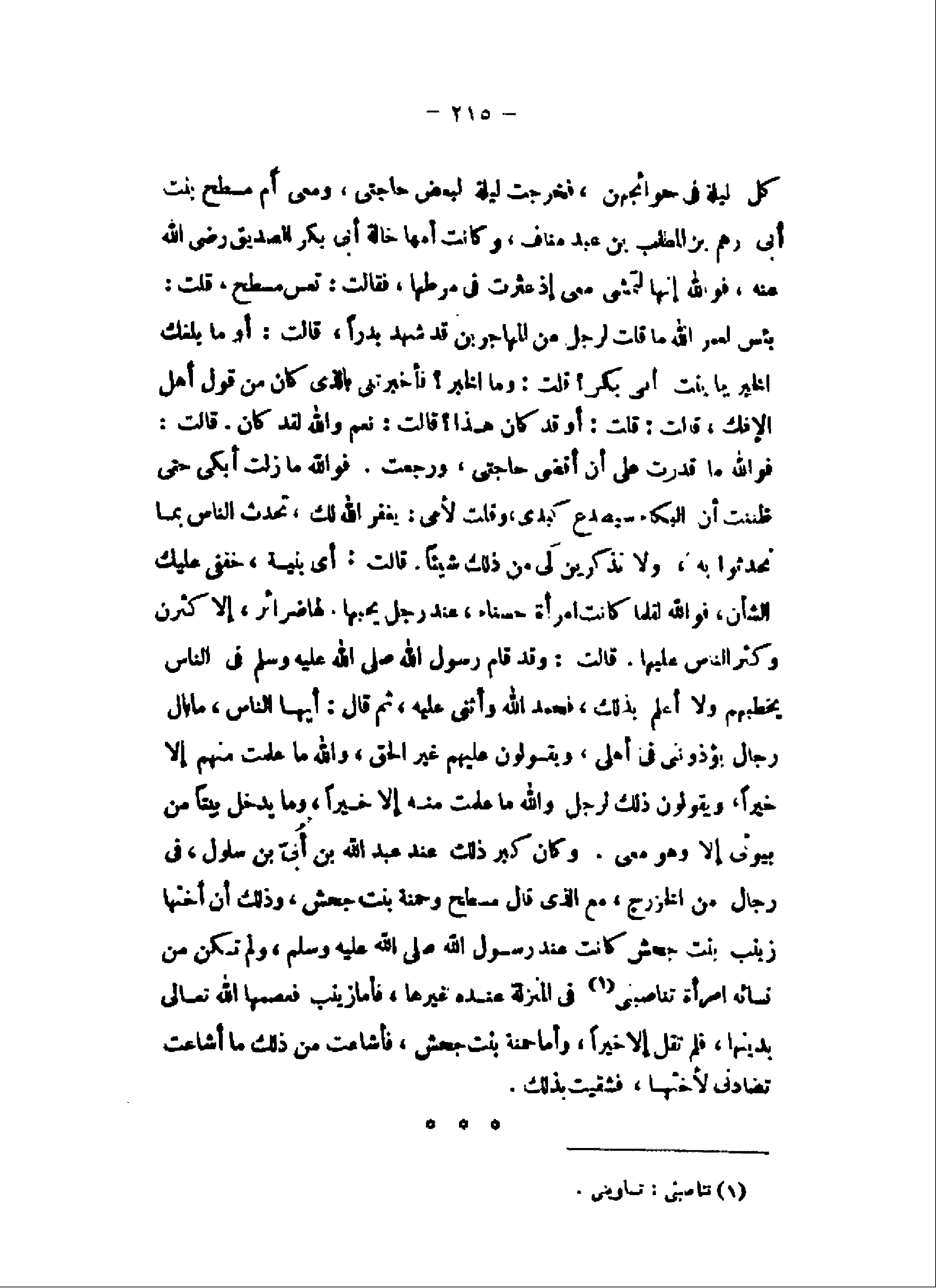 وكان كبر ذلك عند عبد الله بن أبىّ بن سلول، فى رجال من الخزرج، مع الذى قال مسطح وحمنة بنت جحش، وذلك أن أختها زينب بنت جحش كانت عند رسول الله صلى الله عليه وسلم، ولم تكن من نسائه امرأة تناصبنى «1» فى المنزلة عنده غيرها، فأما زينب فعصمها الله تعالى بدينها، فلم تقل إلا خيرا، وأما حمنة بنت جحش، فأشاعت من ذلك ما أشاعت تضادنى لأختها، فشقيت بذلك.