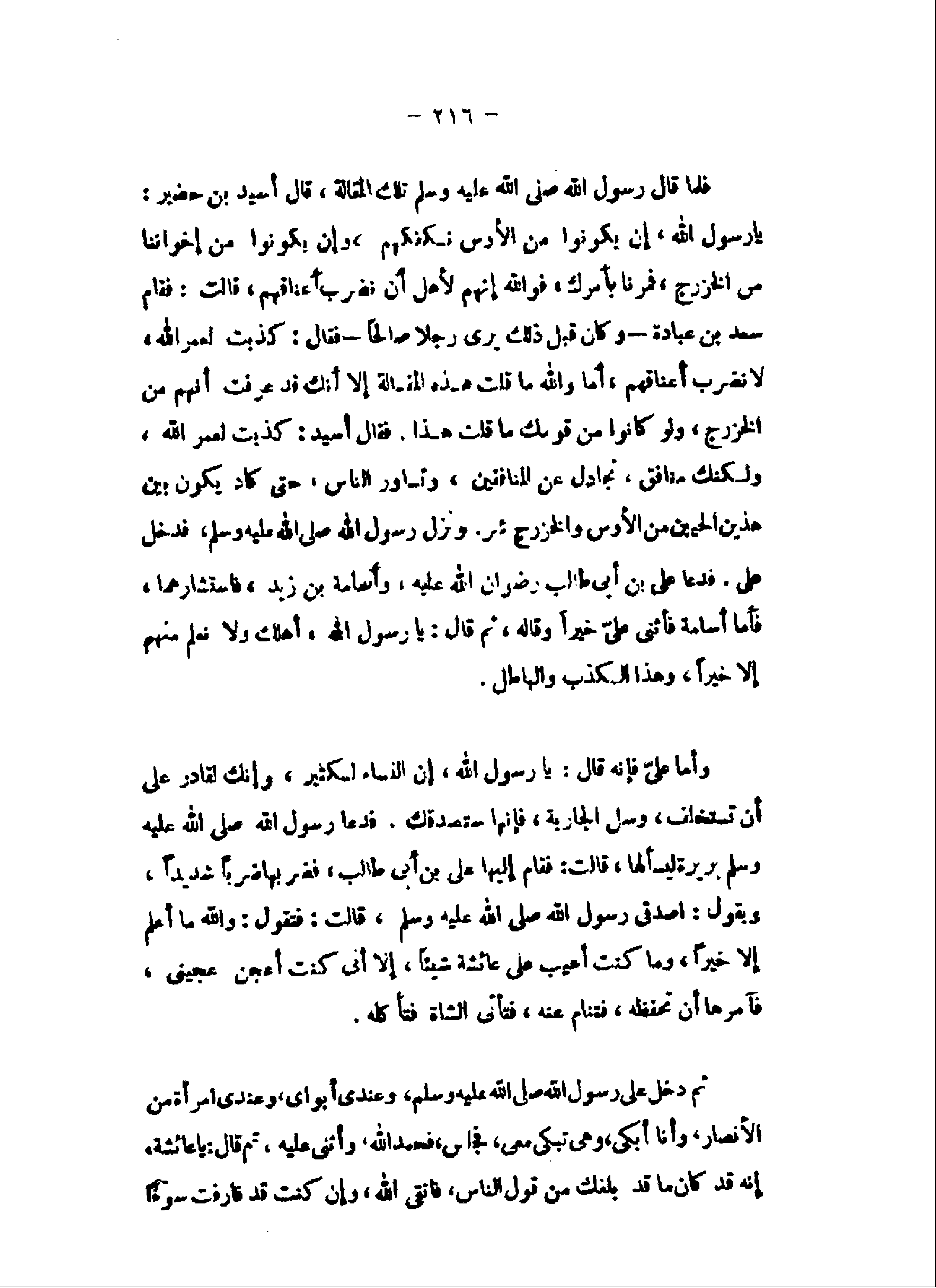 يا رسول الله، إن يكونوا من الأوس نكفكهم، وإن يكونوا من إخواننا من الخزرج، فمرنا بأمرك، فو الله إنهم لأهل أن نضرب أعناقهم، قالت: فقام سعد بن عبادة- وكان قبل ذلك يرى رجلا صالحا- فقال: كذبت لعمر الله، لا نضرب أعناقهم، أما والله ما قلت هذه المقالة إلا أنك قد عرفت أنهم من الخزرج، ولو كانوا من قومك ما قلت هذا. فقال أسيد: كذبت لعمر الله، ولكنك منافق، تجادل عن المنافقين، وتساور الناس، حتى كاد يكون بين هذين الحيين من الأوس والخزرج شر. ونزل رسول الله صلى الله عليه وسلم، فدخل على. فدعا على بن أبى طالب رضوان الله عليه، وأسامة بن زيد، فاستشارهما، فأما أسامة فأثنى علىّ خيرا وقاله، ثم قال: يا رسول الله، أهلك ولا نعلم منهم إلا خيرا، وهذا الكذب والباطل.