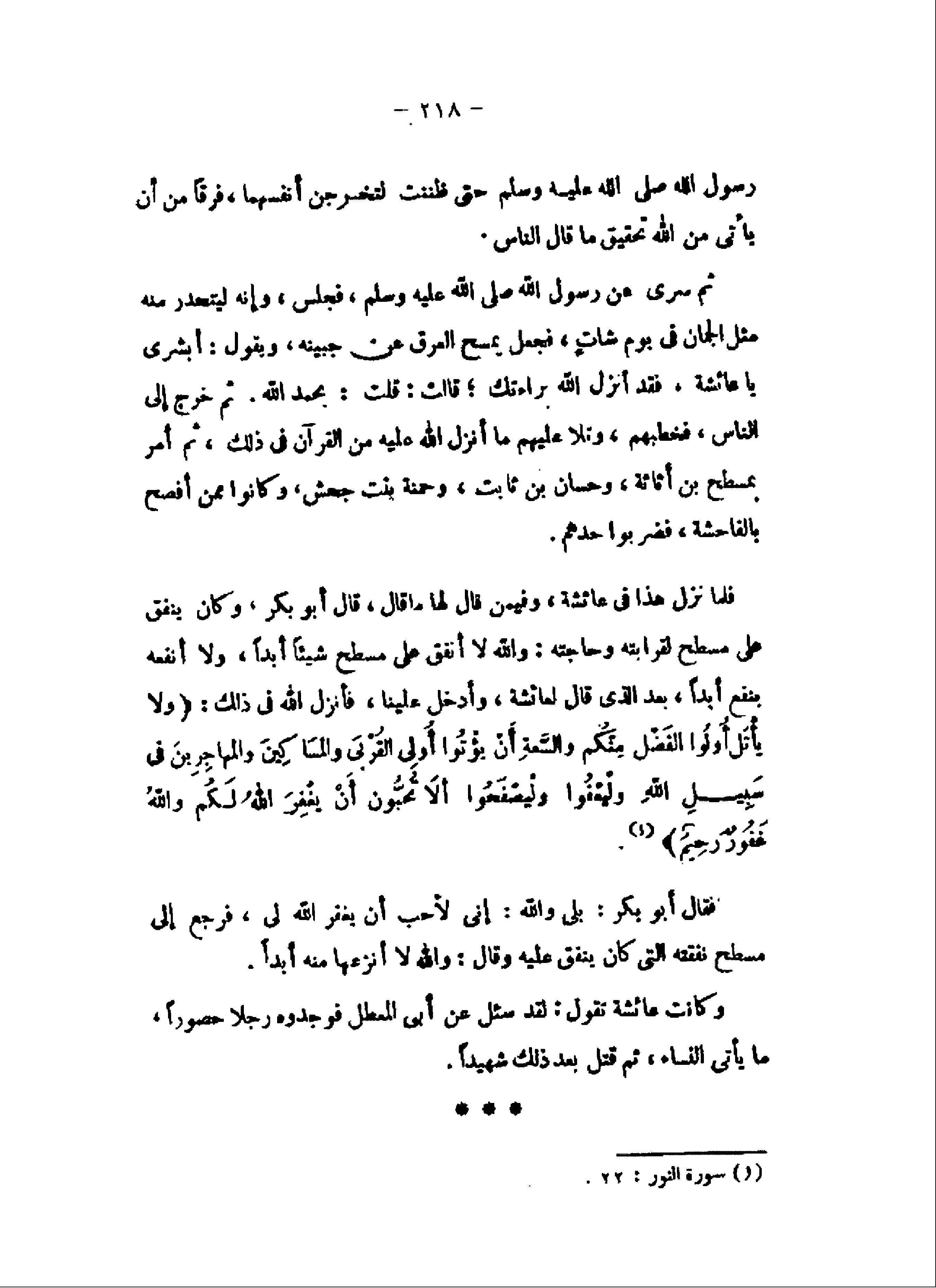 ثم سرى عن رسول الله صلى الله عليه وسلم، فجلس، وإنه ليتحدر منه مثل الجمان فى يوم شات، فجعل يسمح العرق عن جبينه، ويقول: أبشرى يا عائشة، فقد أنزل الله براءتك، قالت: قلت: بحمد الله. ثم خرج إلى الناس، فخطبهم، وتلا عليهم ما أنزل الله عليه من القرآن فى ذلك، ثم أمر بمسطح بن أثاثة، وحسان بن ثابت، وحمنة بنت جحش، وكانوا ممن أفصح بالفاحشة، فضربوا حدهم.