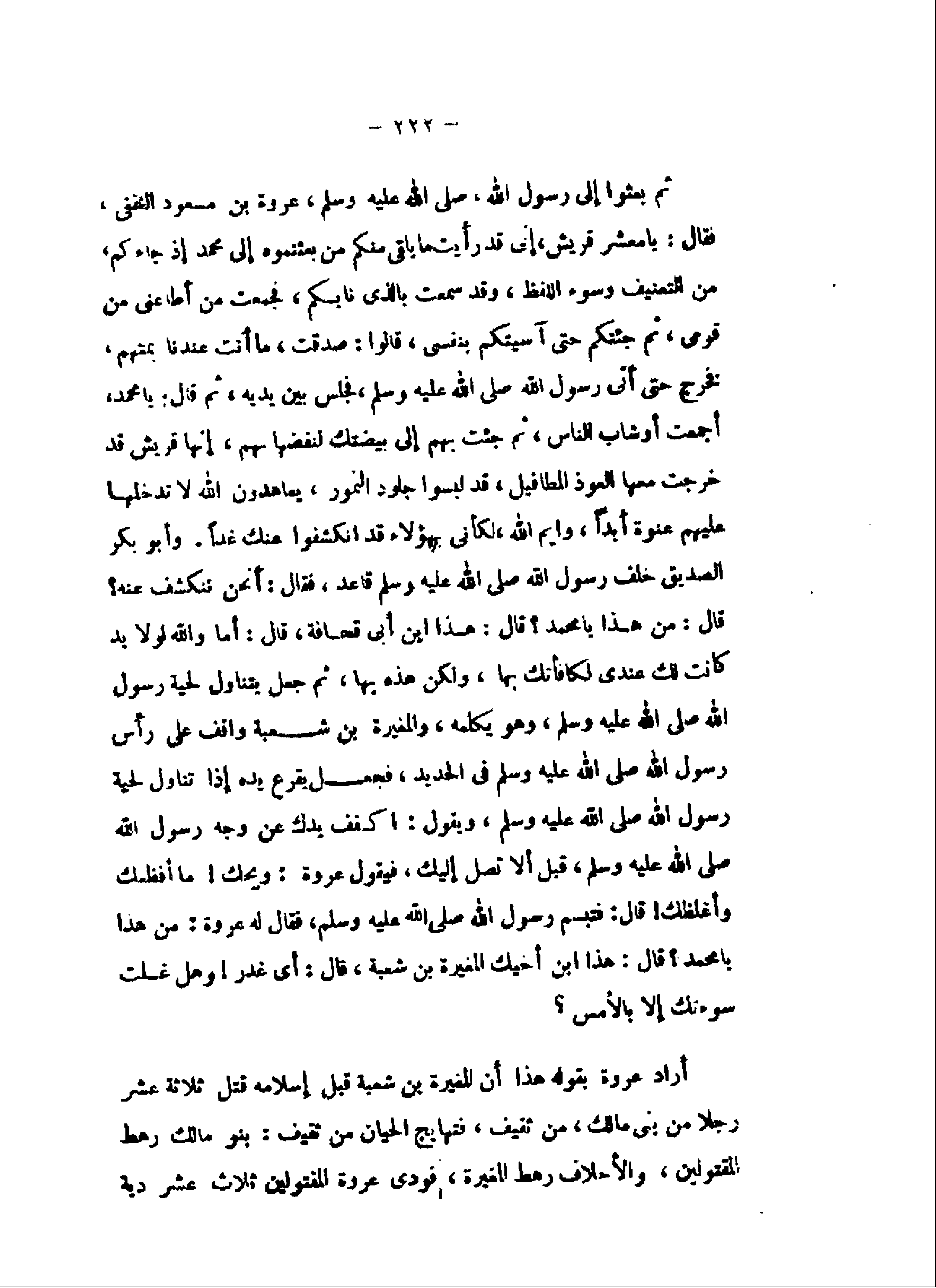 قال: من هذا يا محمد؟ قال: هذا ابن أبى قحافة، قال: أما والله لولا يد كانت لك عندى لكافأتك بها، ولكن هذه بها، ثم جعل يتناول لحية رسول الله صلى الله عليه وسلم، وهو يكلمه، والمغيرة بن شعبة واقف على رأس رسول الله صلى الله عليه وسلم فى الحديد، فجعل يقرع يده إذا تناول لحية رسول الله صلى الله عليه وسلم، ويقول: اكفف يدك عن وجه رسول الله صلى الله عليه وسلم، قبل ألا تصل إليك، فيقول عروة: ويحك! ما أفظعك وأغلظك! قال: فتبسم رسول الله صلى الله عليه وسلم، فقال له عروة: من هذا يا محمد؟ قال: هذا ابن أخيك المغيرة بن شعبة، قال: أى غدر! وهل غسلت سوءتك إلا بالأمس؟