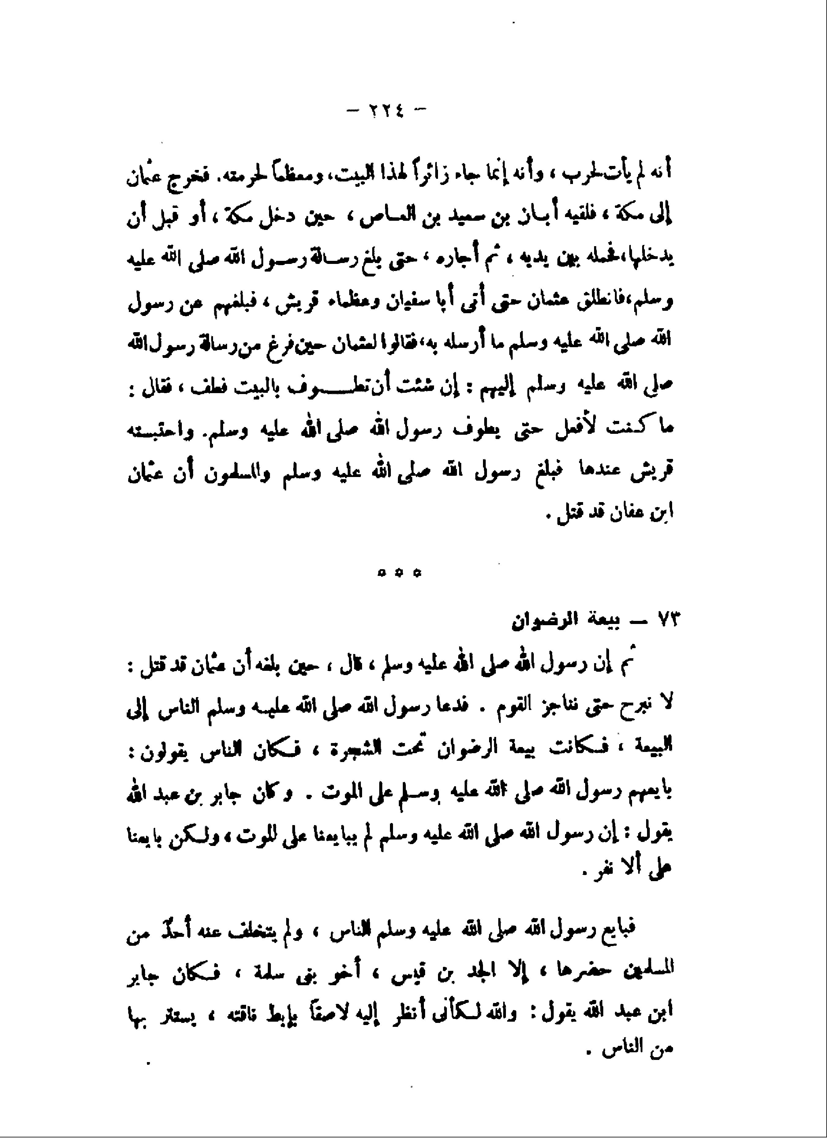 ما كنت لأفعل حتى يطوف رسول الله صلى الله عليه وسلم. واحتبسته قريش عندها فبلغ رسول الله صلى الله عليه وسلم والمسلمون أن عثمان ابن عفان قد قتل.