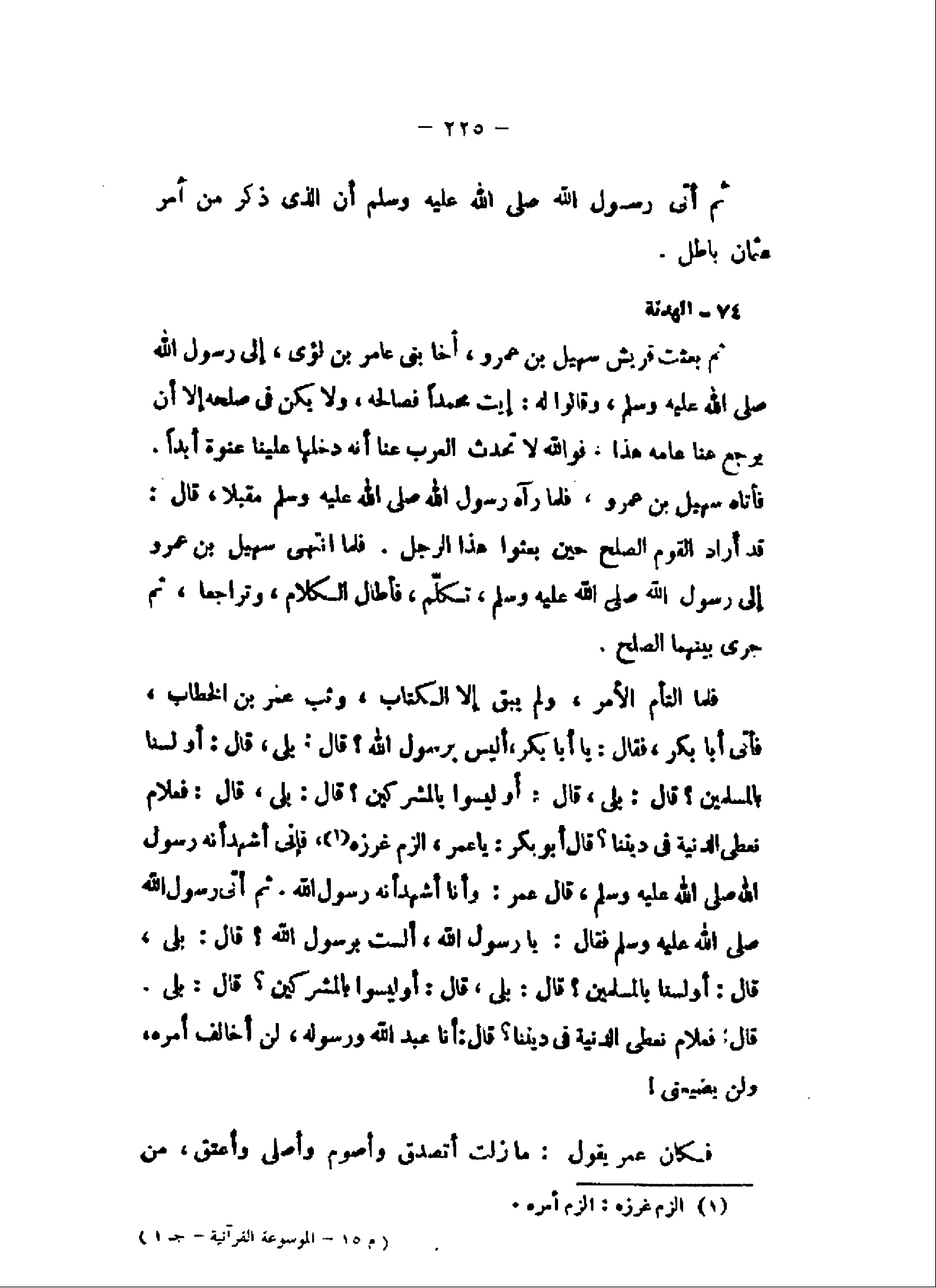 ثم بعثت قريش سهيل بن عمرو، أخا بنى عامر بن لؤى، إلى رسول الله صلى الله عليه وسلم، وقالوا له: إيت محمدا فصالحه، ولا يكن فى صلحه إلا ان يرجع عنا عامه هذا، فو الله لا تحدث العرب عنا أنه دخلها علينا عنوة أبدا.