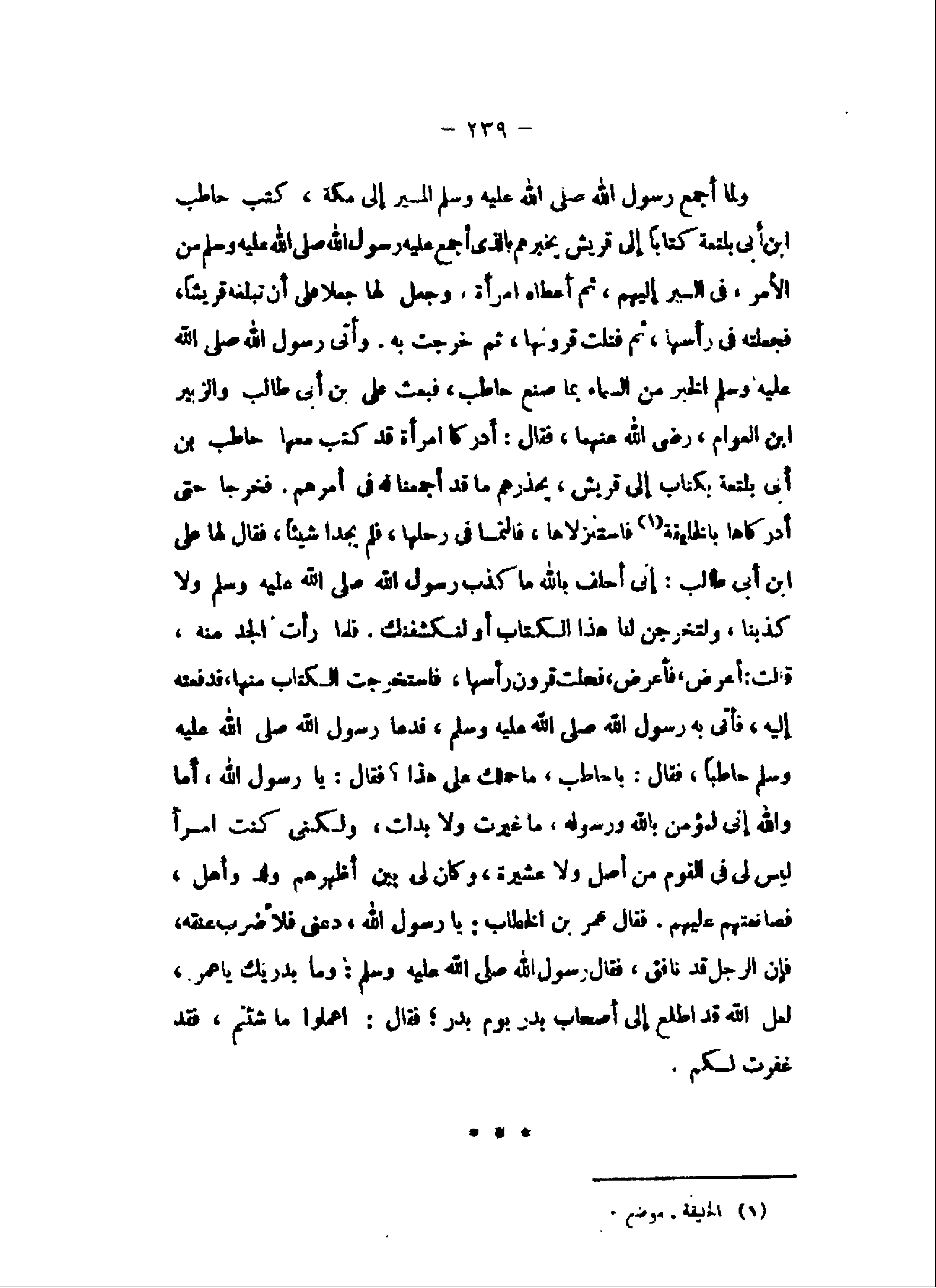وأتى رسول الله صلى الله عليه وسلم الخبر من السماء بما صنع حاطب، فبعث على بن أبى طالب والزبير ابن العوام، رضى الله عنهما، فقال: أدركا امرأة قد كتب معها حاطب بن أبى بلتعة بكتاب إلى قريش، يحذرهم ما قد أجمعنا له فى أمرهم. فخرجا حتى أدركاها بالخليفة «1» فاستنزلاها، فالتمسا فى رحلها، فلم يجدا شيئا، فقال لها على ابن أبى طالب: إنى أحلف بالله ما كذب رسول الله صلى الله عليه وسلم ولا كذبنا، ولتخرجن لنا هذا الكتاب أو لنكشفنك. فلما رأت الجد منه، قالت: أعرض، فأعرض، فحلت قرون رأسها، فاستخرجت الكتاب منها، فدفعته إليه، فأتى به رسول الله صلى الله عليه وسلم، فدعا رسول الله صلى الله عليه وسلم حاطبا، فقال: يا حاطب، ما حملك على هذا؟ فقال: يا رسول الله، أما والله إنى لمؤمن بالله ورسوله، ما غيرت ولا بدلت، ولكنى كنت امرأ ليس لى فى القوم من أصل ولا عشيرة، وكان لى بين أظهرهم ولد وأهل، فصانعتهم عليهم. فقال عمر بن الخطاب: يا رسول الله، دعنى فلأضرب عنقه، فإن الرجل قد نافق، فقال رسول الله صلى الله عليه وسلم: وما يدريك يا عمر، لعل الله قد اطلع إلى أصحاب بدر يوم بدر، فقال: اعملوا ما شئتم، فقد غفرت لكم.