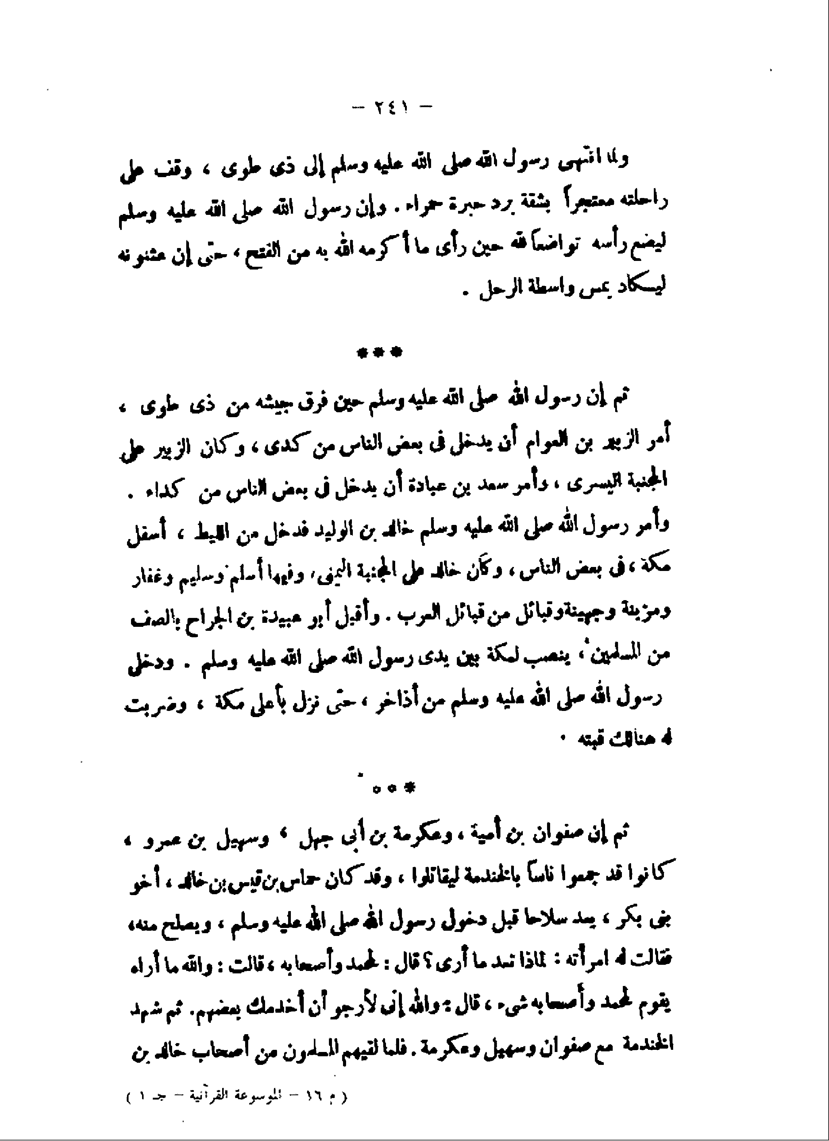 وأمر رسول الله صلى الله عليه وسلم خالد بن الوليد فدخل من الليط، أسفل مكة، فى بعض الناس، وكان خالد على المجنبة اليمنى، وفيها أسلم وسليم وغفار ومزينة وجهينة وقبائل من قبائل العرب. وأقبل أبو عبيدة بن الجراح بالصف من المسلمين، ينصب لمكة بين يدى رسول الله صلى الله عليه وسلم. ودخل رسول الله صلى الله عليه وسلم من أذاخر، حتى نزل بأعلى مكة، وضربت له هنالك قبته.
