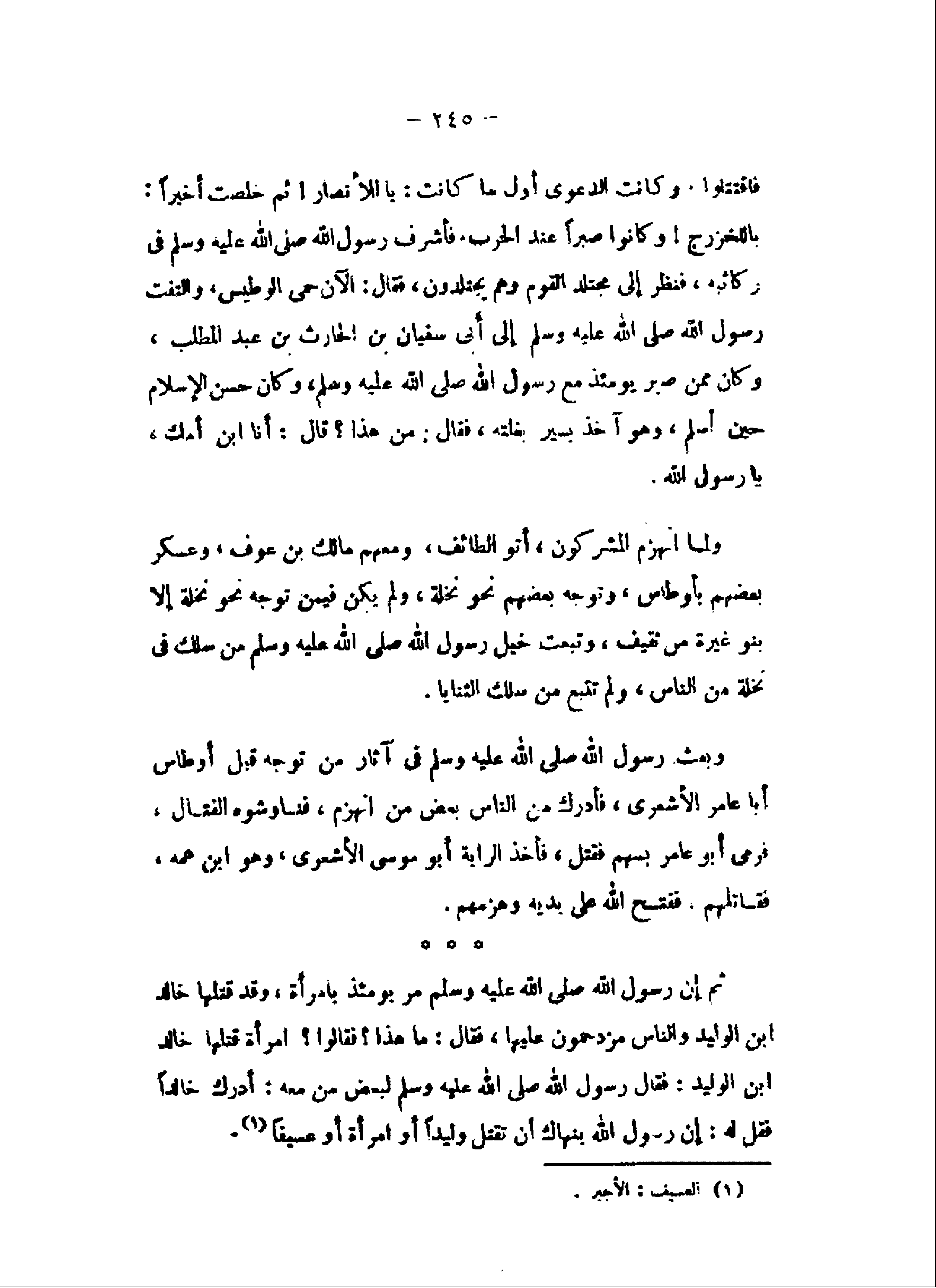 وبعث رسول الله صلى الله عليه وسلم فى آثار من توجه قبل أوطاس أبا عامر الأشعرى، فأدرك من الناس بعض من انهزم، فناوشوه القتال، فرمى أبو عامر بسهم فقتل، فأخذ الراية أبو موسى الأشعرى، وهو ابن عمه، فقاتلهم، ففتح الله على يديه وهزمهم.