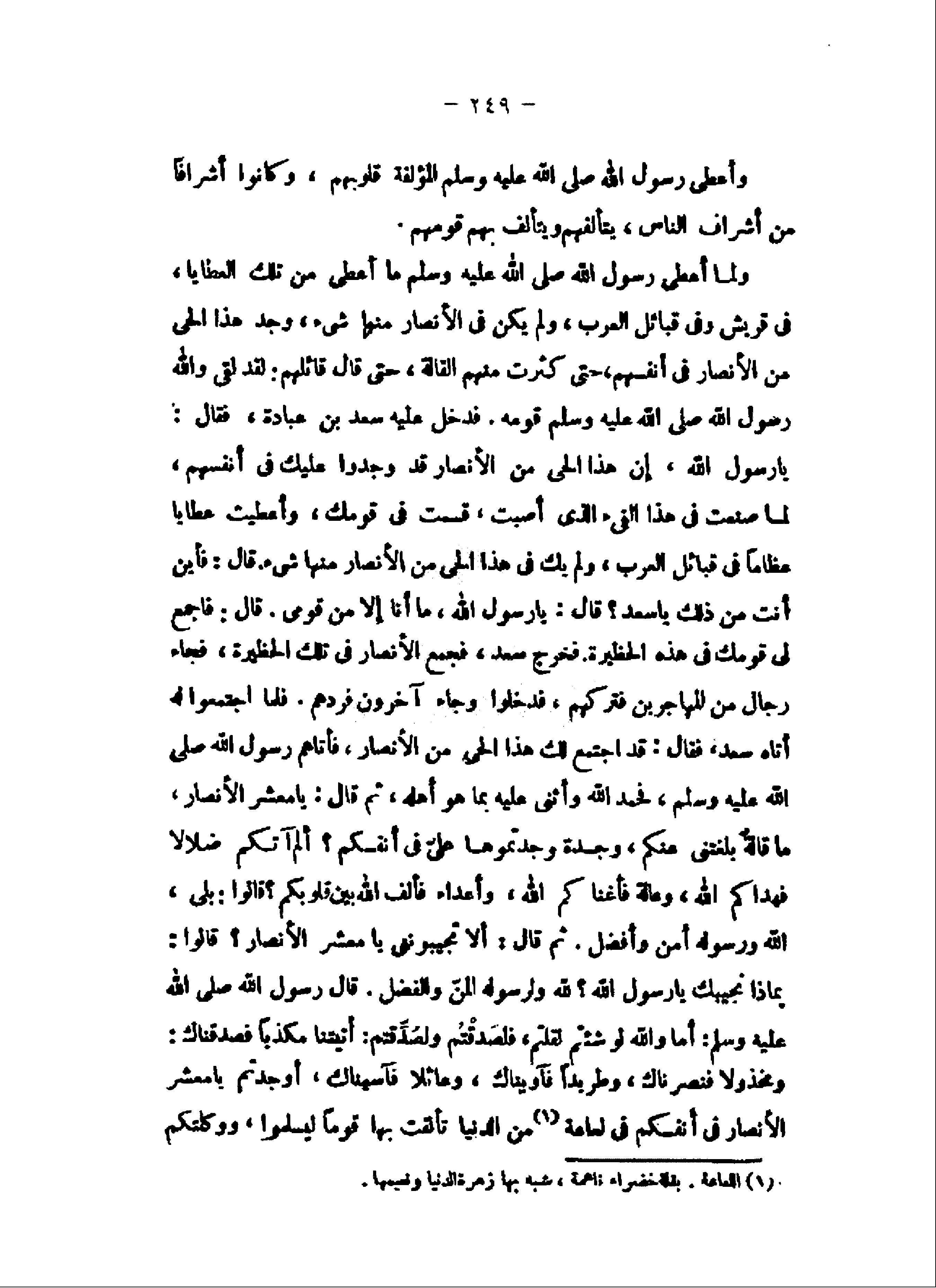 يا رسول الله، إن هذا الحى من الأنصار قد وجدوا عليك فى أنفسهم، لما صنعت فى هذا الفىء الذى أصبت، قسمت فى قومك، وأعطيت عطايا عظاما فى قبائل العرب، ولم يك فى هذا الحى من الأنصار منها شىء. قال: فأين أنت من ذلك يا سعد؟ قال: يا رسول الله، ما أنا إلا من قومى. قال: فاجمع لى قومك فى هذه الحظيرة. فخرج سعد، فجمع الأنصار فى تلك الحظيرة، فجاء رجال من المهاجرين فتركهم، فدخلوا وجاء آخرون فردهم.