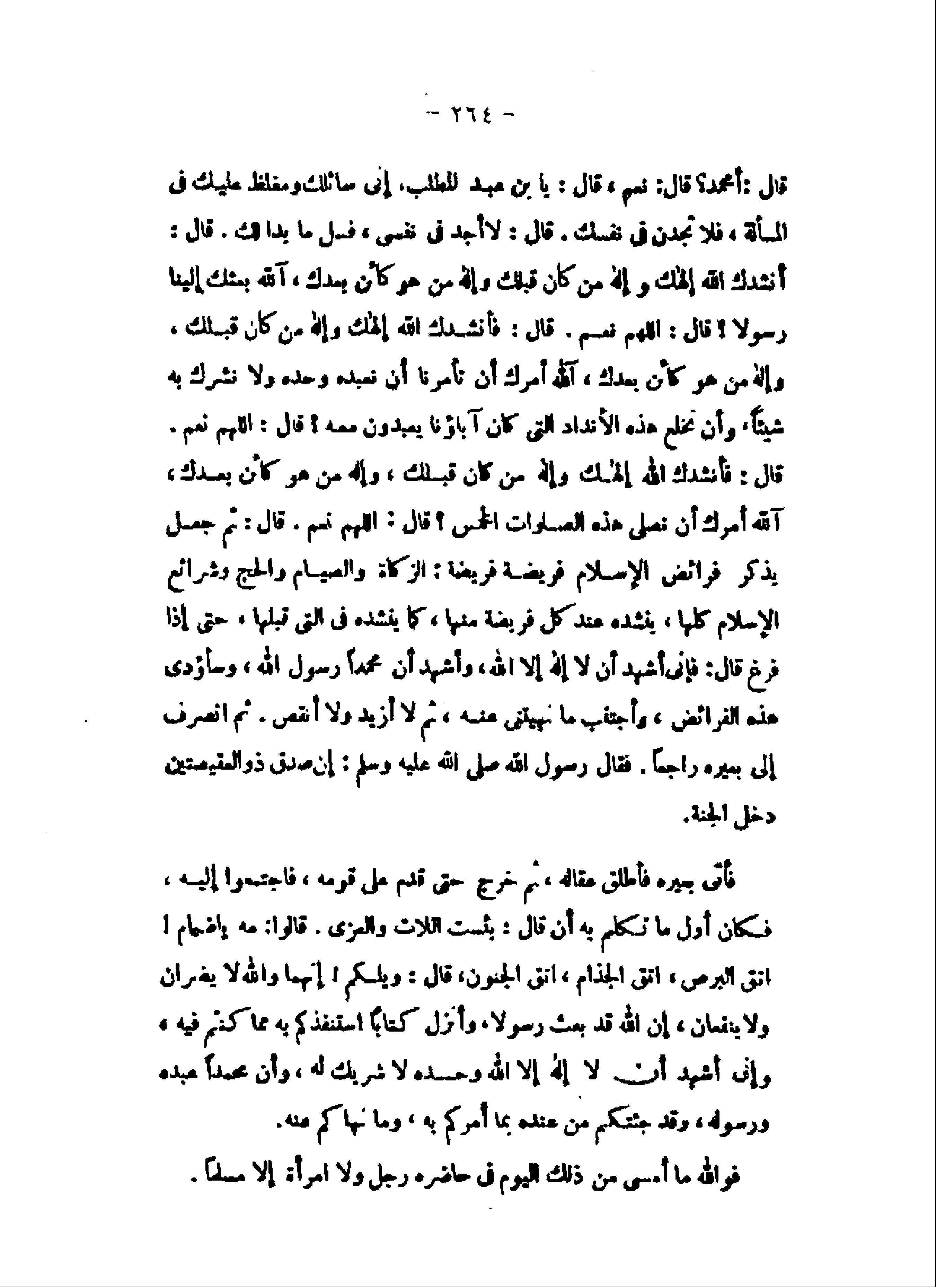 أنشدك الله إلهك وإله من كان قبلك وإله من هو كائن بعدك، الله بعثك إلينا رسولا؟ قال: اللهم نعم. قال: فأنشدك الله إلهك وإله من كان قبلك، وإله من هو كائن بعدك، الله أمرك أن تأمرنا أن نعبده وحده ولا نشرك به شيئا، وأن نخلع هذه الأنداد التى كان آباؤنا يعبدون معه؟ قال: اللهم نعم.
