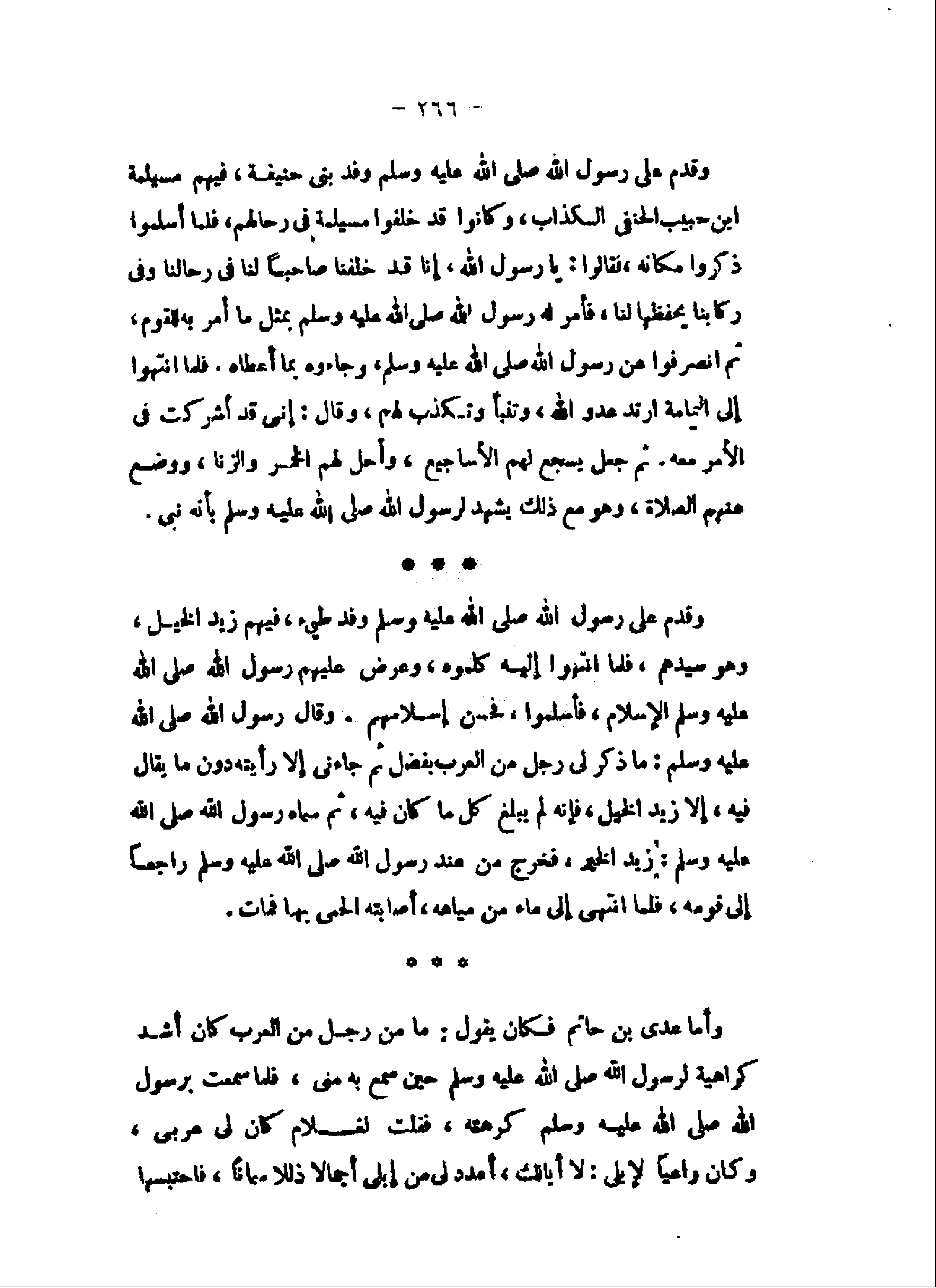 وقدم على رسول الله صلى الله عليه وسلم وفد بنى حنيفة، فيهم مسيلمة ابن حبيب الحنفى الكذاب، وكانوا قد خلفوا مسيلمة فى رحالهم، فلما أسلموا ذكروا مكانه، فقالوا: يا رسول الله، إنا قد خلفنا صاحبا لنا فى رحالنا وفى ركابنا يحفظها لنا، فأمر له رسول الله صلى الله عليه وسلم بمثل ما أمر به للقوم، ثم انصرفوا عن رسول الله صلى الله عليه وسلم، وجاءوه بما أعطاه. فلما انتهوا إلى اليمامة ارتد عدو الله، وتنبأ وتكذب لهم، وقال: إنى قد أشركت فى الأمر معه. ثم جعل يسجع لهم الأساجيع، وأحل لهم الخمر والزنا، ووضع عنهم الصلاة، وهو مع ذلك يشهد لرسول الله صلى الله عليه وسلم بأنه نبى.
