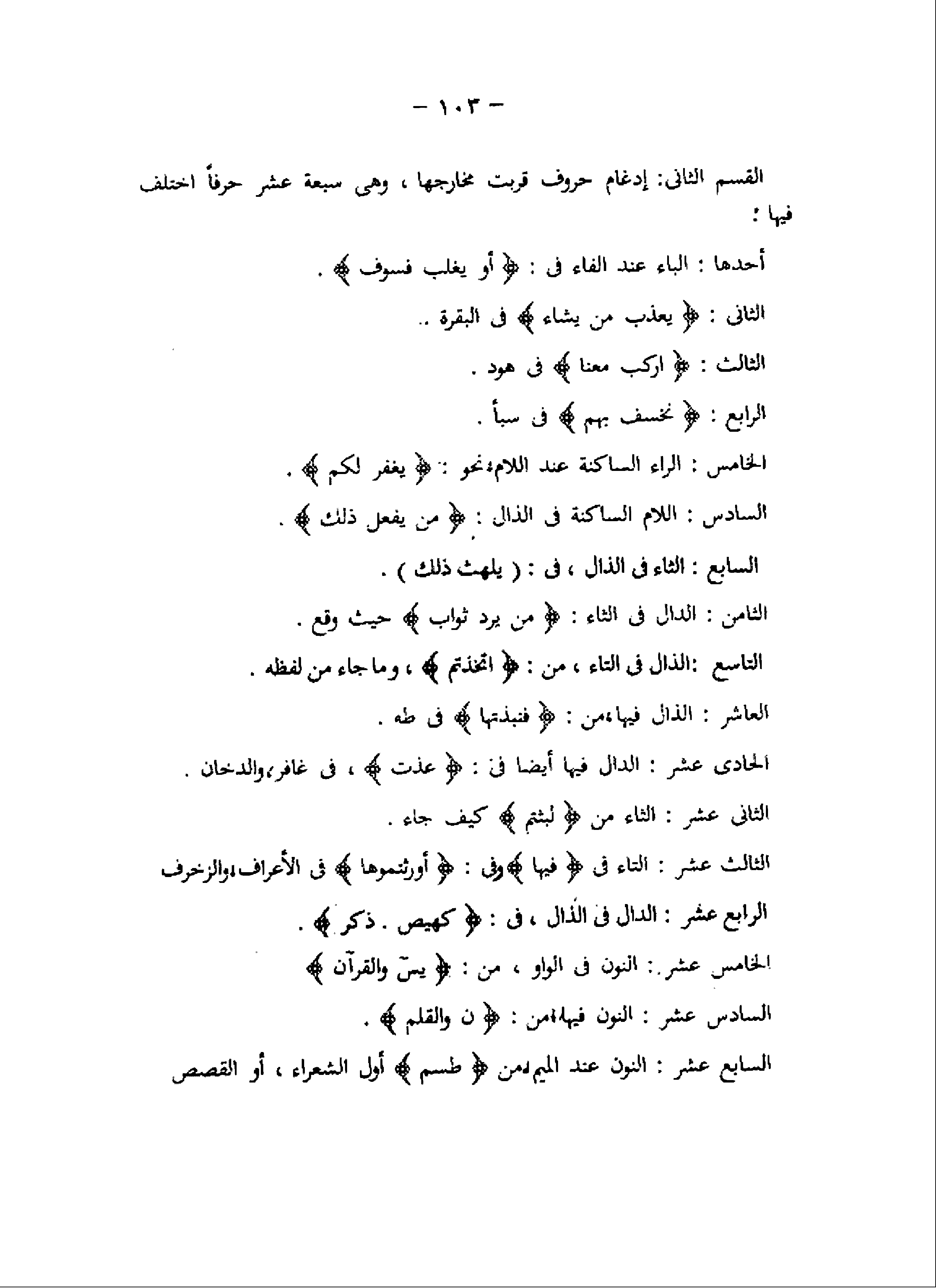 القسم الثانى: إدغام حروف قربت مخارجها، وهى سبعة عشر حرفا اختلف فيها: