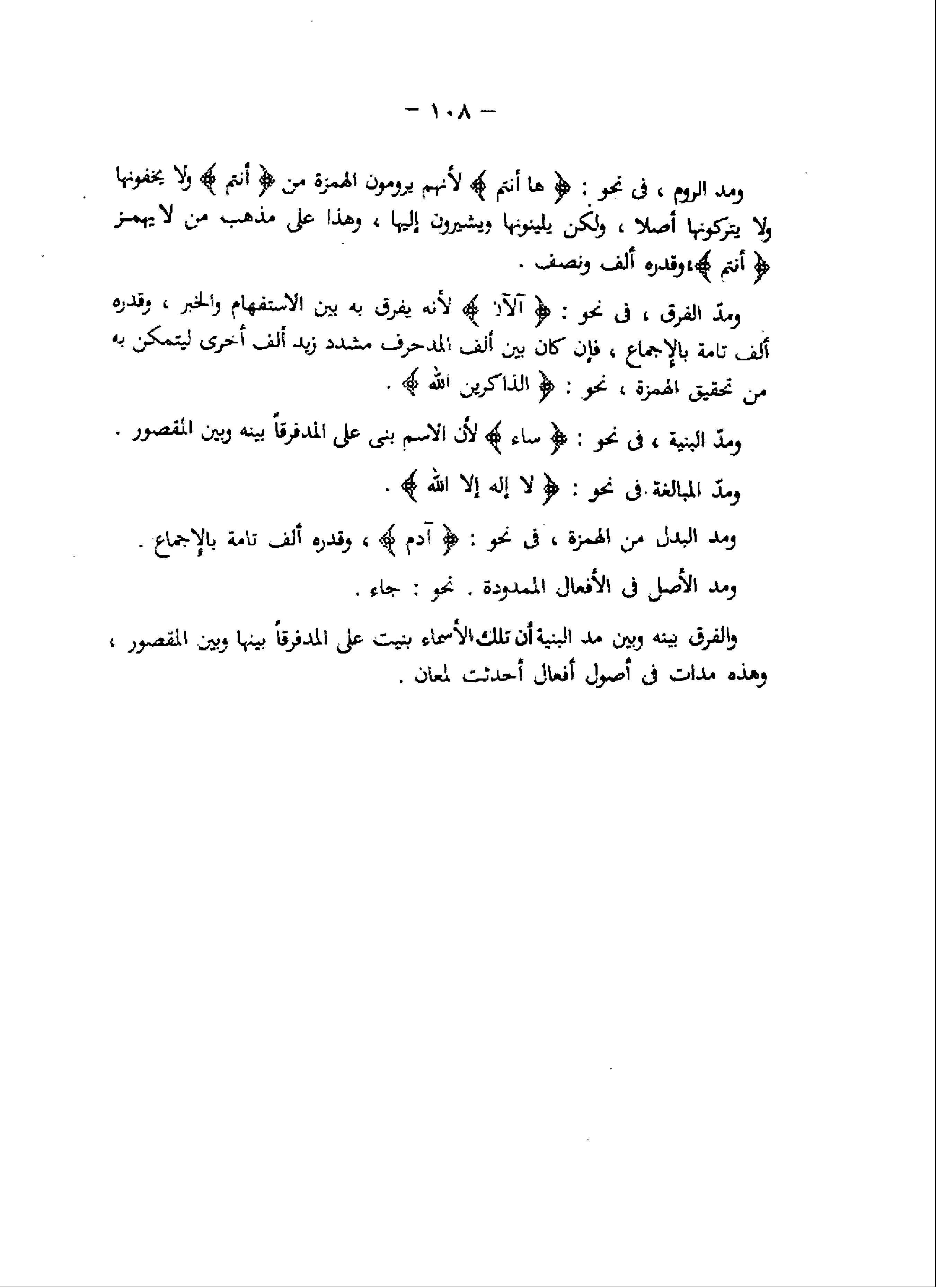 ومدّ الفرق، فى نحو: آلْآنَ لأنه يفرق به بين الاستفهام والخبر، وقدره ألف تامة بالإجماع، فإن كان بين ألف المدحرف مشدد زيد ألف أخرى ليتمكن به من تحقيق الهمزة، نحو: الذَّاكِرِينَ اللَّهَ.