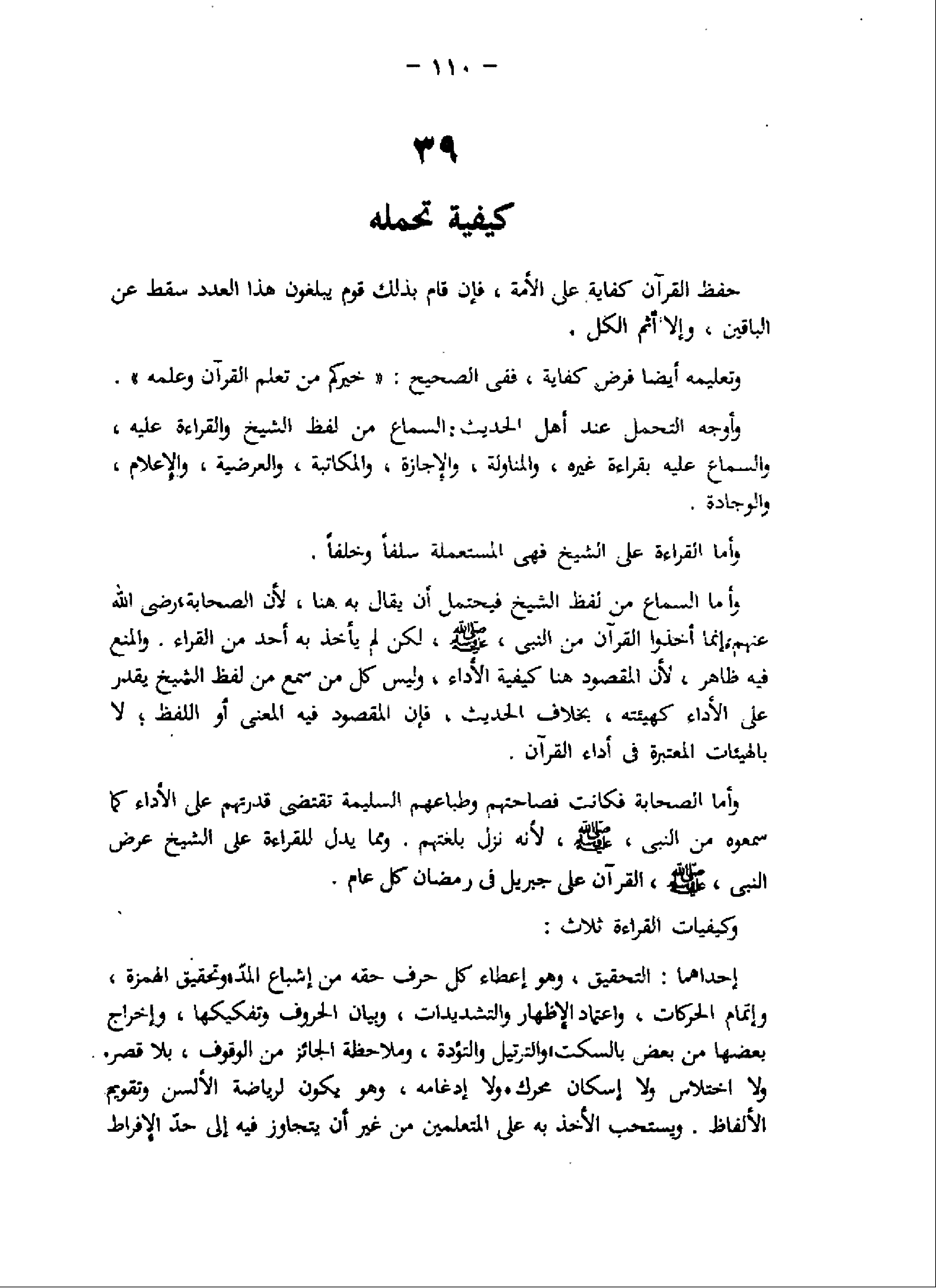 وأما الصحابة فكانت فصاحتهم وطباعهم السليمة تقتضى قدرتهم على الأداء كما سمعوه من النبى، صلّى اللَّه عليه وسلم، لأنه نزل بلغتهم. وما يدل للقراءة على الشيخ عرض النبى، صلّى اللَّه عليه وسلم، القرآن على جبريل فى رمضان كل عام.