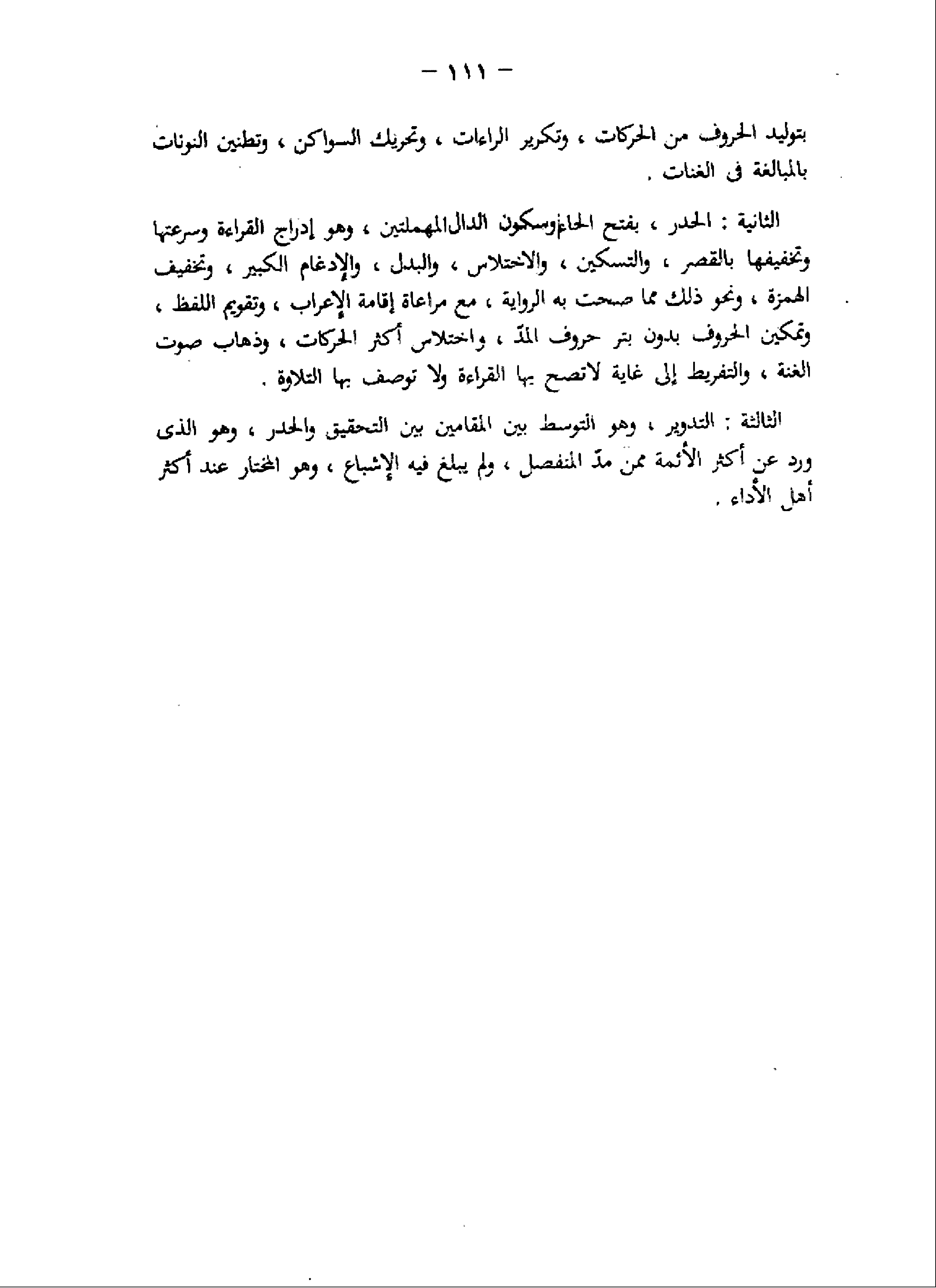 الثانية: الحدر، بفتح الحاء وسكون الدال المهملتين، وهو إدراج القراءة وسرعتها وتخفيفها بالقصر، والتسكين، والاختلاس، والبدل، والإدغام الكبير، وتخفيف الهمزة، ونحو ذلك مما صحت به الرواية، مع مراعاة إقامة الإعراب، وتقويم اللفظ، وتمكين الحروف بدون بتر حروف المدّ، واختلاس أكثر الحركات، وذهاب صوت الغنة، والتفريط إلى غاية لا تصح بها القراءة ولا توصف بها التلاوة.