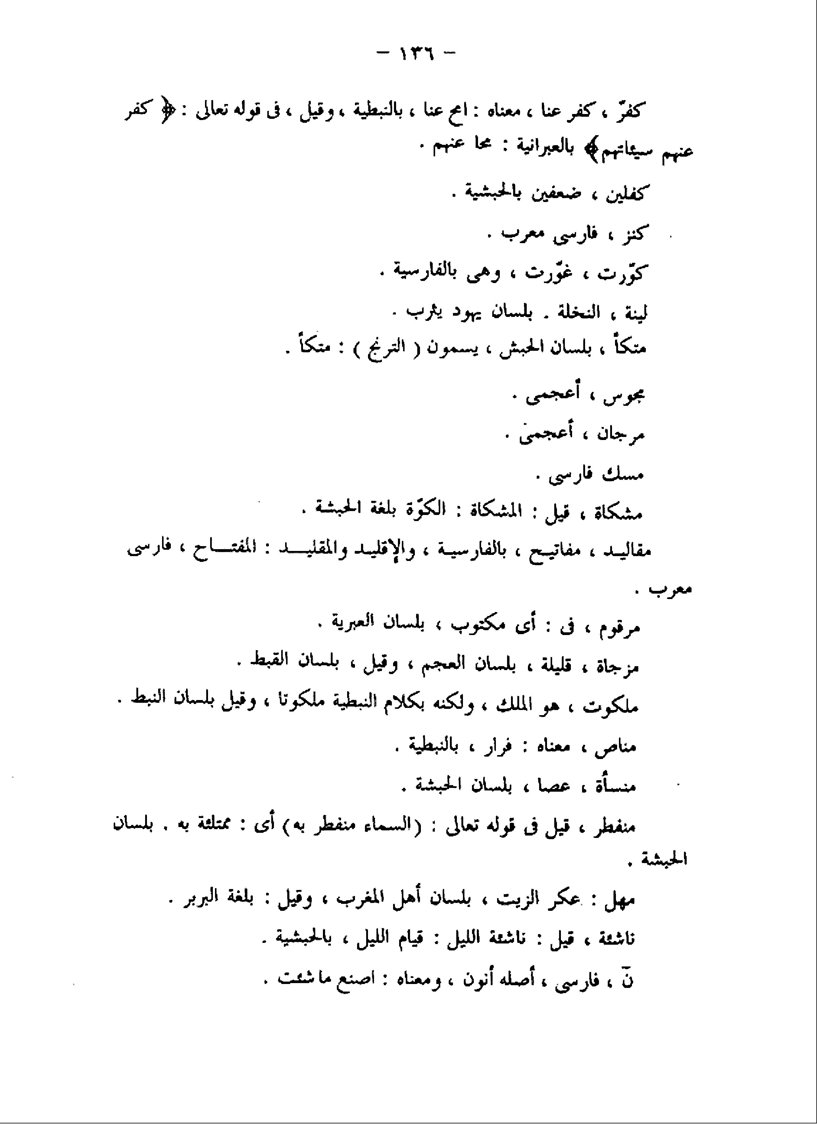 كفّر، كفر عنا، معناه: امح عنا، بالنبطية، وقيل، فى قوله تعالى: كَفَّرَ عَنْهُمْ سَيِّئاتِهِمْ بالعبرانية: محا عنهم.