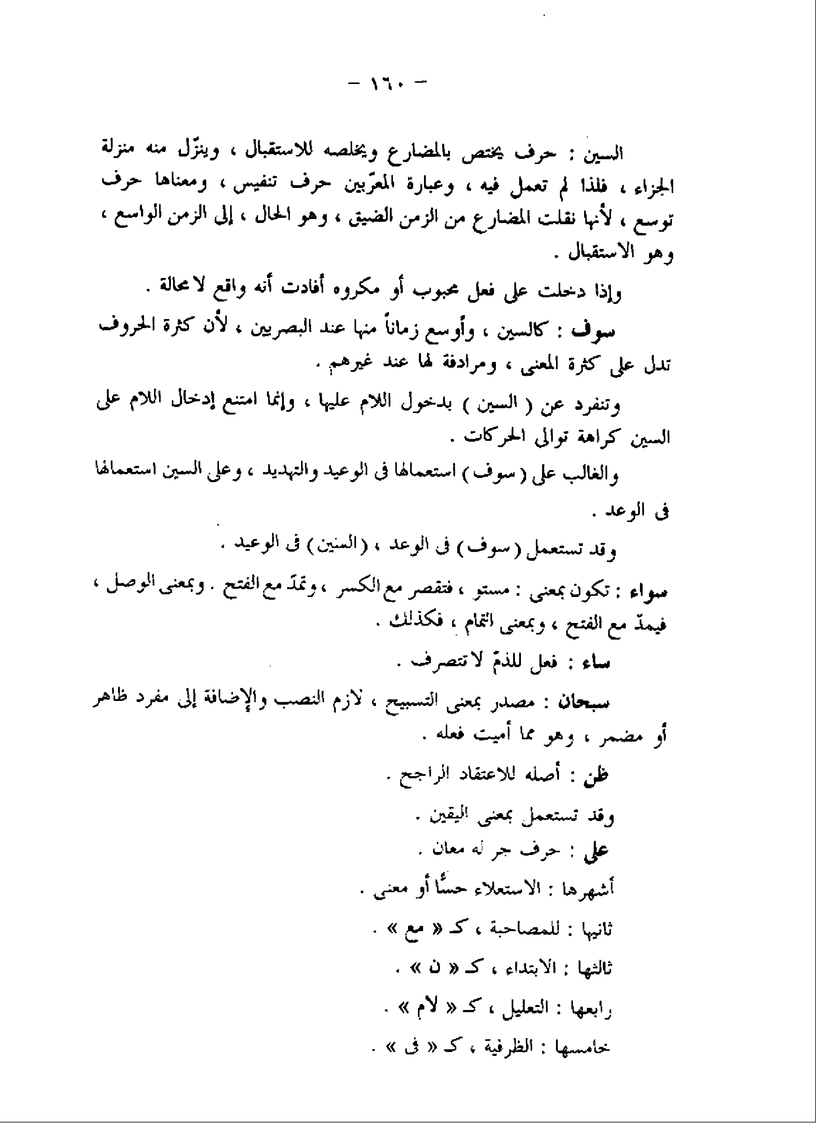 السين: حرف يختص بالمضارع ويخلصه للاستقبال، وينزّل منه منزلة الجزاء، فلذا لم تعمل فيه، وعبارة المعرّبين حرف تنفيس، ومعناها حرف توسع، لأنها نقلت المضارع من الزمن الضيق، وهو الحال، إلى الزمن الواسع، وهو الاستقبال.