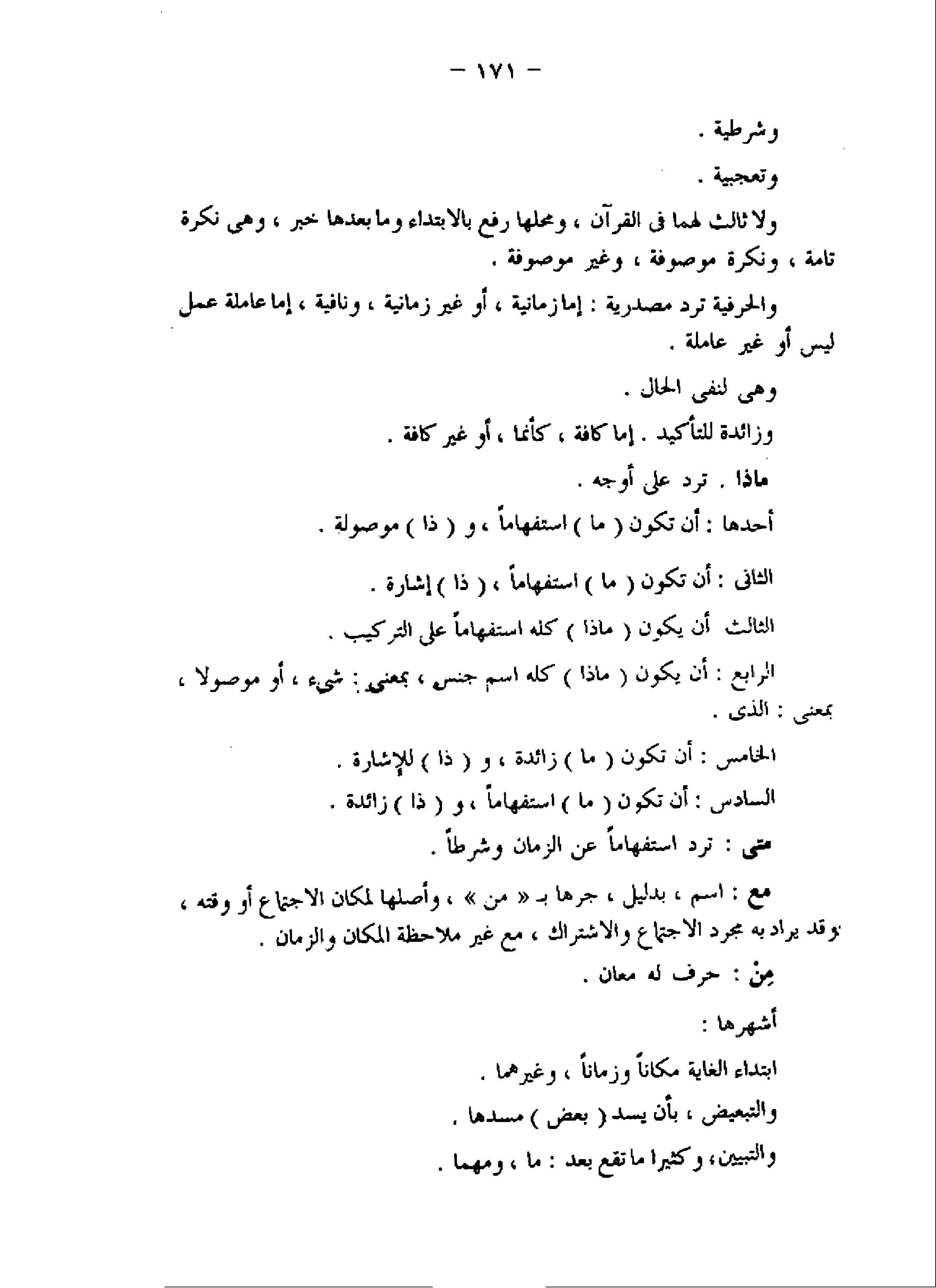 والحرفية ترد مصدرية: إما زمانية، أو غير زمانية، ونافية، إما عاملة عمل ليس أو غير عاملة.