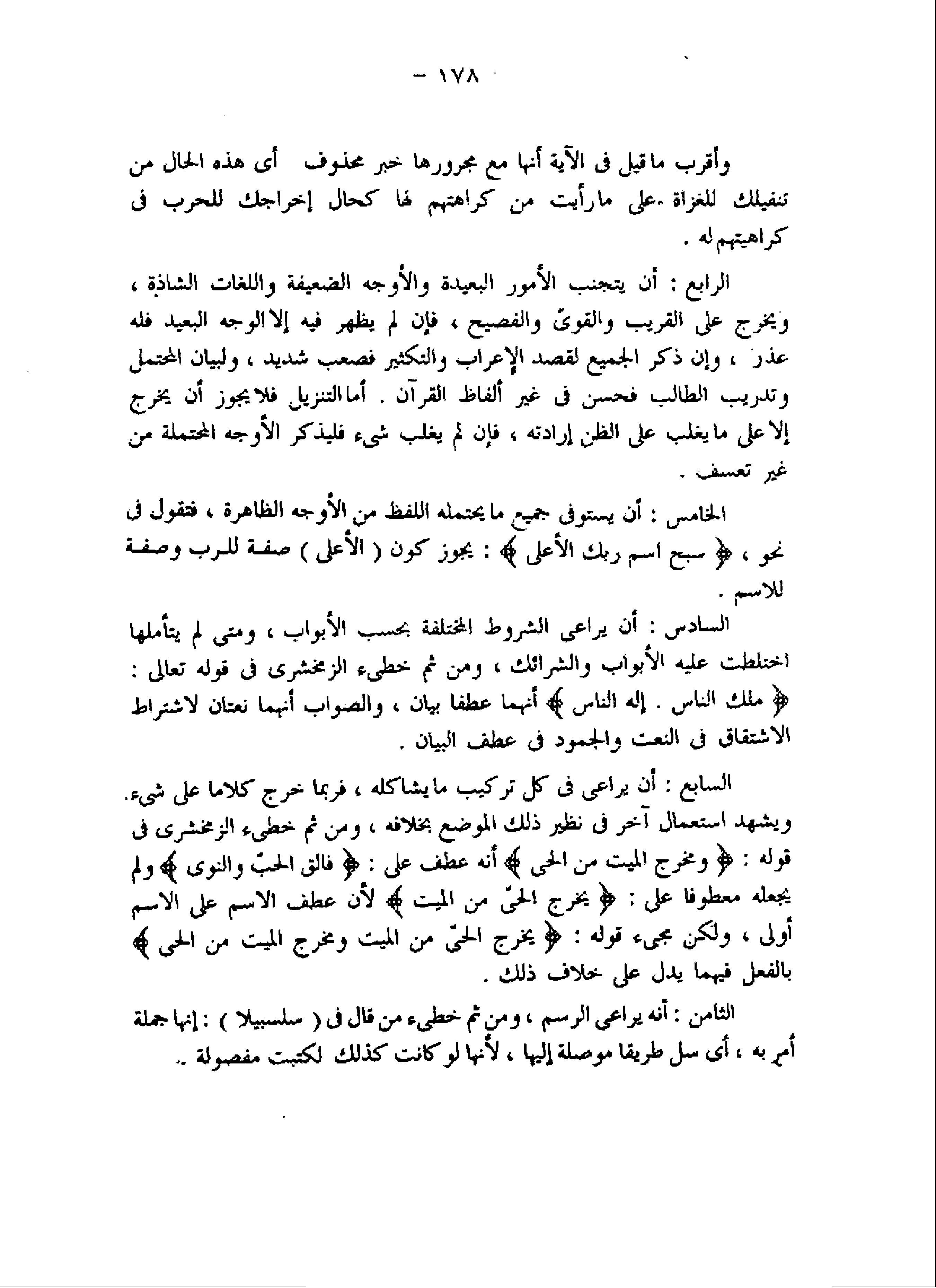 السادس: أن يراعى الشروط المختلفة بحسب الأبواب، ومتى لم يتأملها اختلطت عليه الأبواب والشرائك، ومن ثم خطىء الزمخشرى فى قوله تعالى: