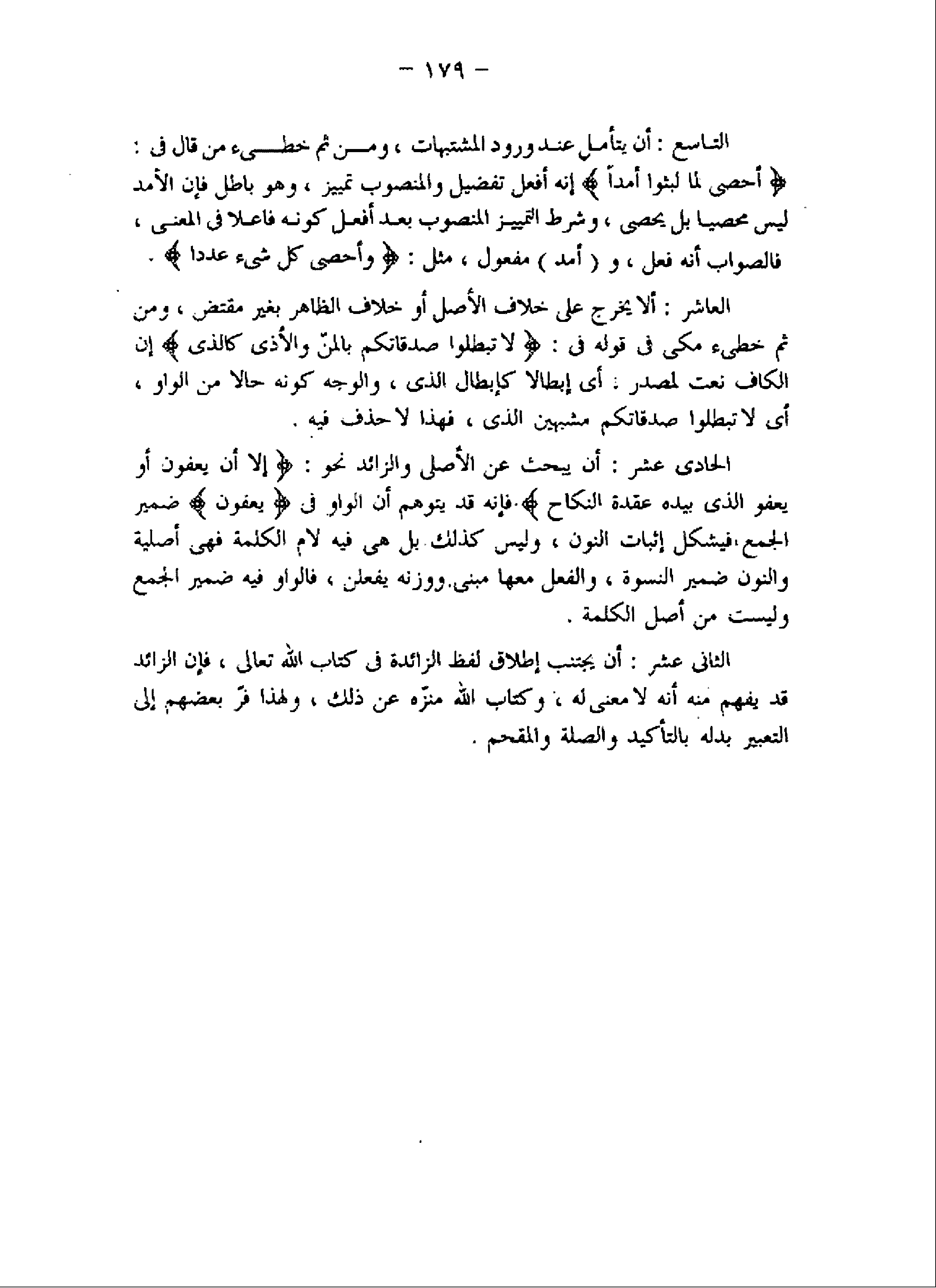 العاشر: ألا يخرج على خلاف الأصل أو خلاف الظاهر بغير مقتض، ومن ثم خطىء مكى فى قوله فى: لا تُبْطِلُوا صَدَقاتِكُمْ بِالْمَنِّ وَالْأَذى كَالَّذِي إن الكاف نعت لمصدر: أى إبطالا كإبطال الذى، والوجه كونه حالا من الواو، أى لا تبطلوا صدقاتكم مشبهين الذى، فهذا لا حذف فيه.