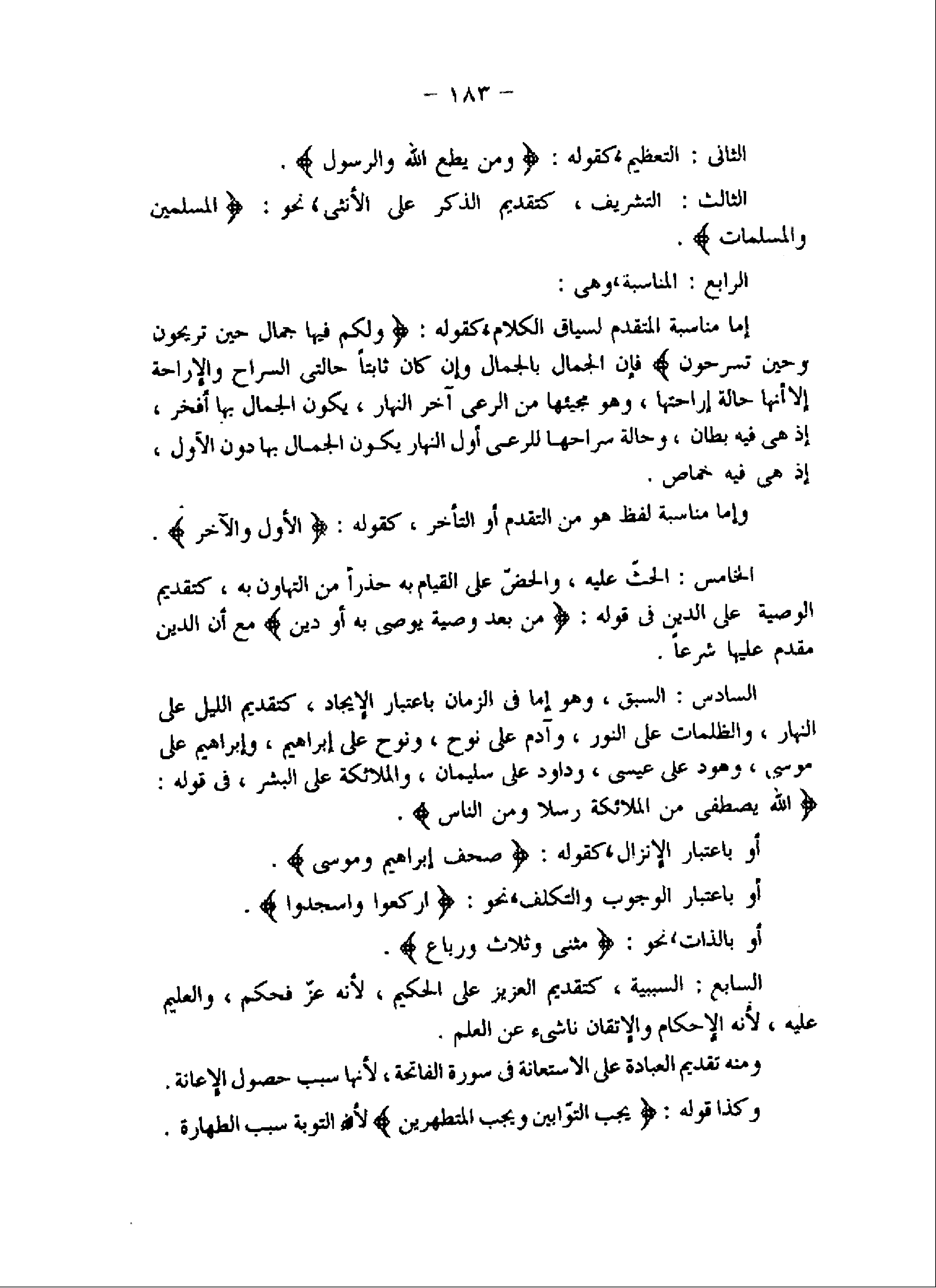 السادس: السبق، وهو إما فى الزمان باعتبار الإيجاد، كتقديم الليل على النهار، والظلمات على النور، وآدم على نوح، ونوح على إبراهيم، وإبراهيم على موسى، وهود على عيسى، وداود على سليمان، والملائكة على البشر، فى قوله: