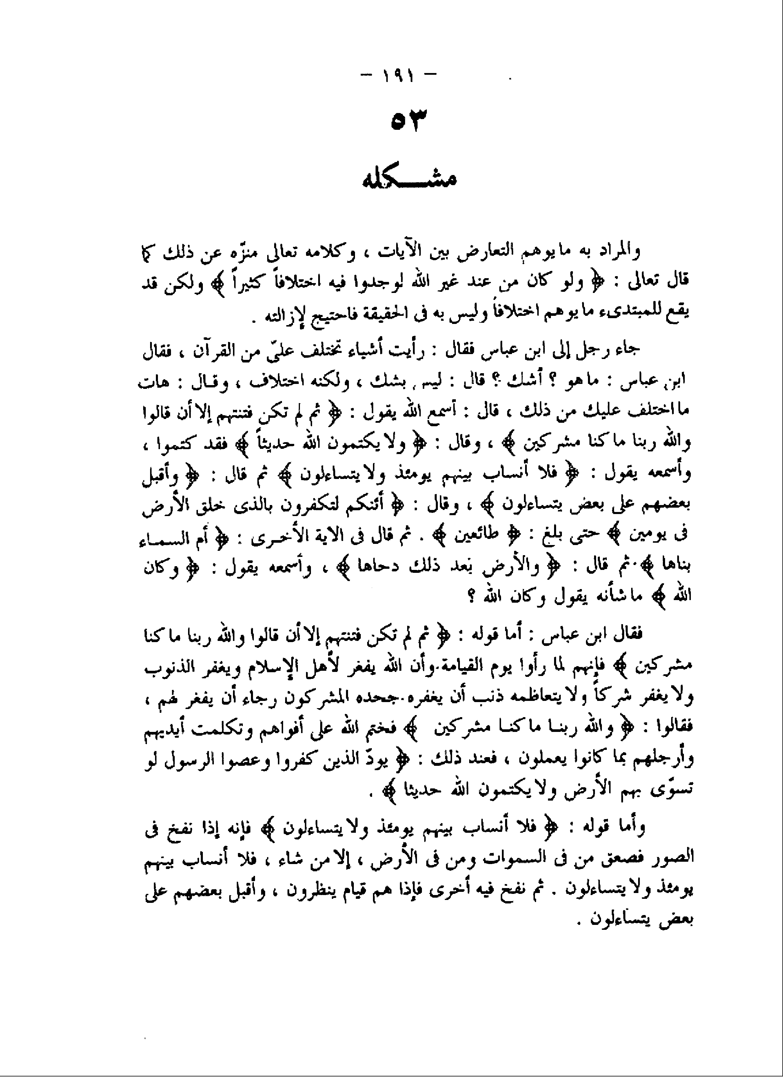 جاء رجل إلى ابن عباس فقال: رأيت أشياء تختلف علىّ من القرآن، فقال ابن عباس: ما هو؟ أشك؟ قال: ليس بشك، ولكنه اختلاف، وقال: هات ما اختلف عليك من ذلك، قال: أسمع اللَّه يقول: ثُمَّ لَمْ تَكُنْ فِتْنَتُهُمْ إِلَّا أَنْ قالُوا وَاللَّهِ رَبِّنا ما كُنَّا مُشْرِكِينَ، وقال: وَلا يَكْتُمُونَ اللَّهَ حَدِيثاً فقد كتموا، وأسمعه يقول:، فَلا أَنْسابَ بَيْنَهُمْ يَوْمَئِذٍ وَلا يَتَساءَلُونَ ثم قال: وَأَقْبَلَ بَعْضُهُمْ عَلى بَعْضٍ يَتَساءَلُونَ، وقال: أَإِنَّكُمْ لَتَكْفُرُونَ بِالَّذِي خَلَقَ الْأَرْضَ فِي يَوْمَيْنِ حتى بلغ: طائِعِينَ. ثم قال فى الآية الأخرى: أَمِ السَّماءُ بَناها، ثم قال: وَالْأَرْضَ بَعْدَ ذلِكَ دَحاها، وأسمعه يقول: وَكانَ اللَّهُ ما شأنه يقول وكان اللَّه؟