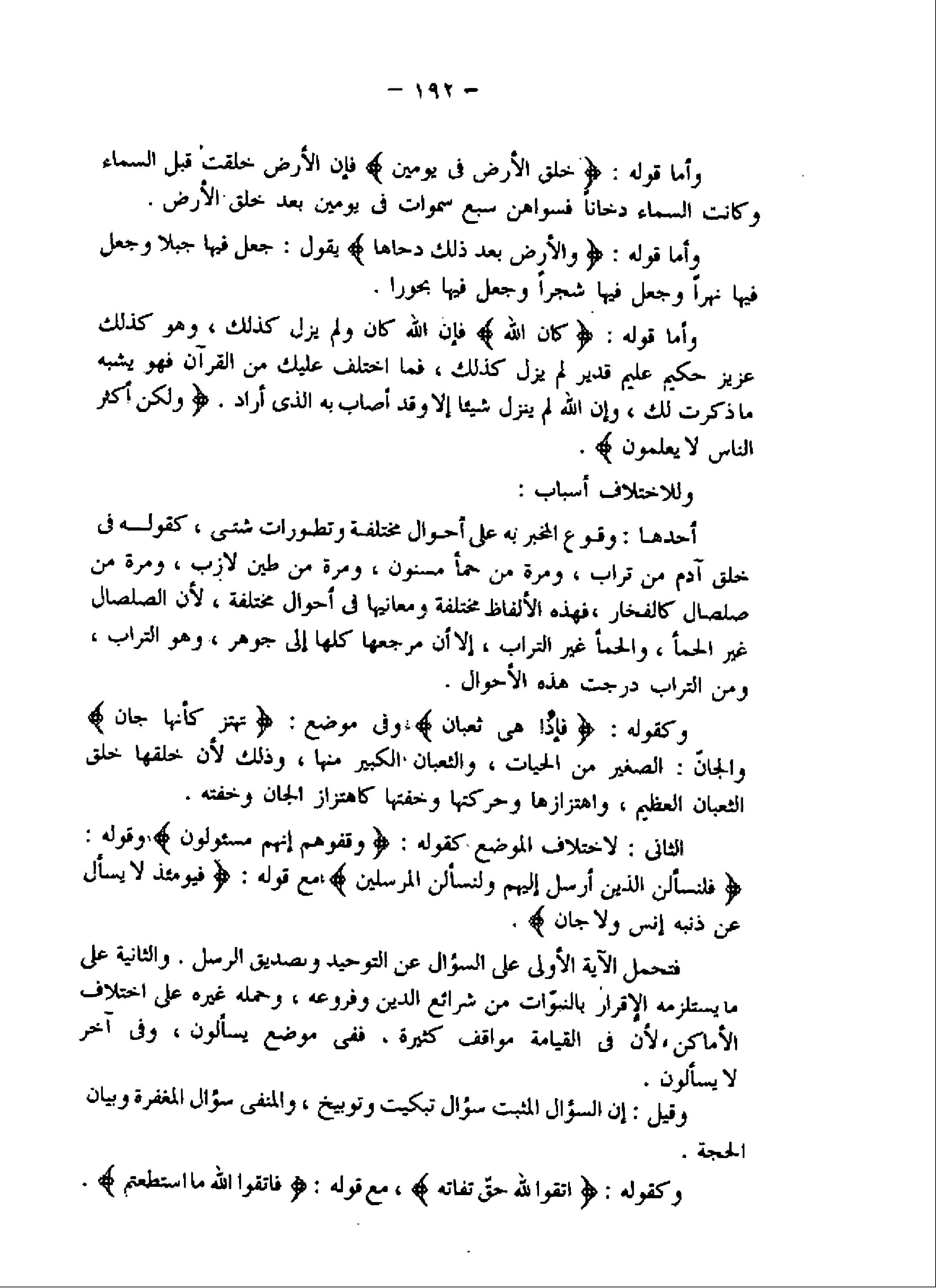 فتحمل الآية الأولى على السؤال عن التوحيد وتصديق الرسل. والثانية على ما يستلزمه الإقرار بالنبوّات من شرائع الدين وفروعه، وحمله غيره على اختلاف الأماكن، لأن فى القيامة مواقف كثيرة، ففى موضع يسألون، وفى آخر لا يسألون.