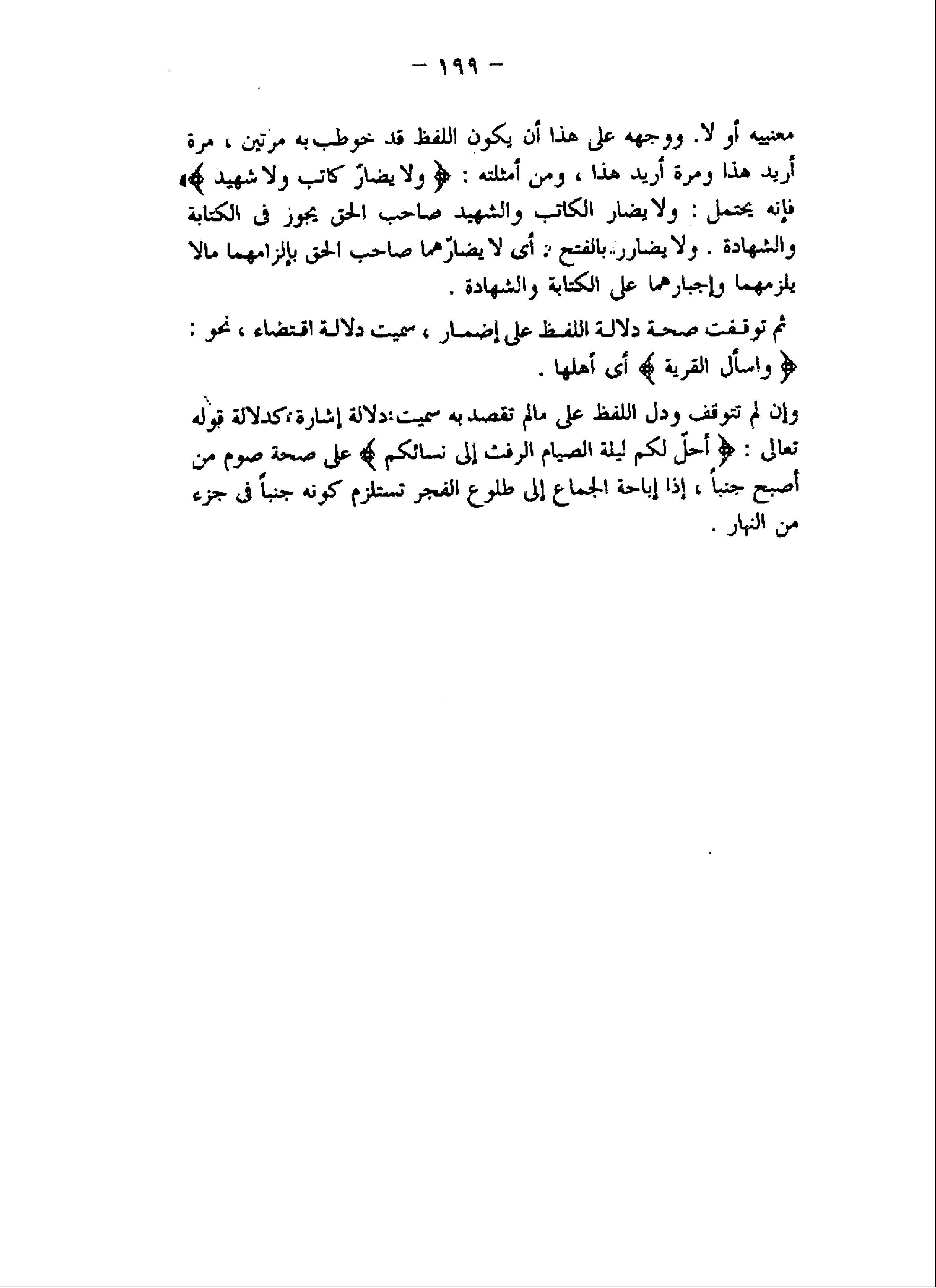 وإن لم تتوقف ودل اللفظ على ما لم تقصد به سميت دلالة إشارة، كدلالة قوله تعالى: أُحِلَّ لَكُمْ لَيْلَةَ الصِّيامِ الرَّفَثُ إِلى نِسائِكُمْ على صحة صوم من أصبح جنبا، إذا إباحة الجماع إلى طلوع الفجر تستلزم كونه جنبا فى جزء من النهار.