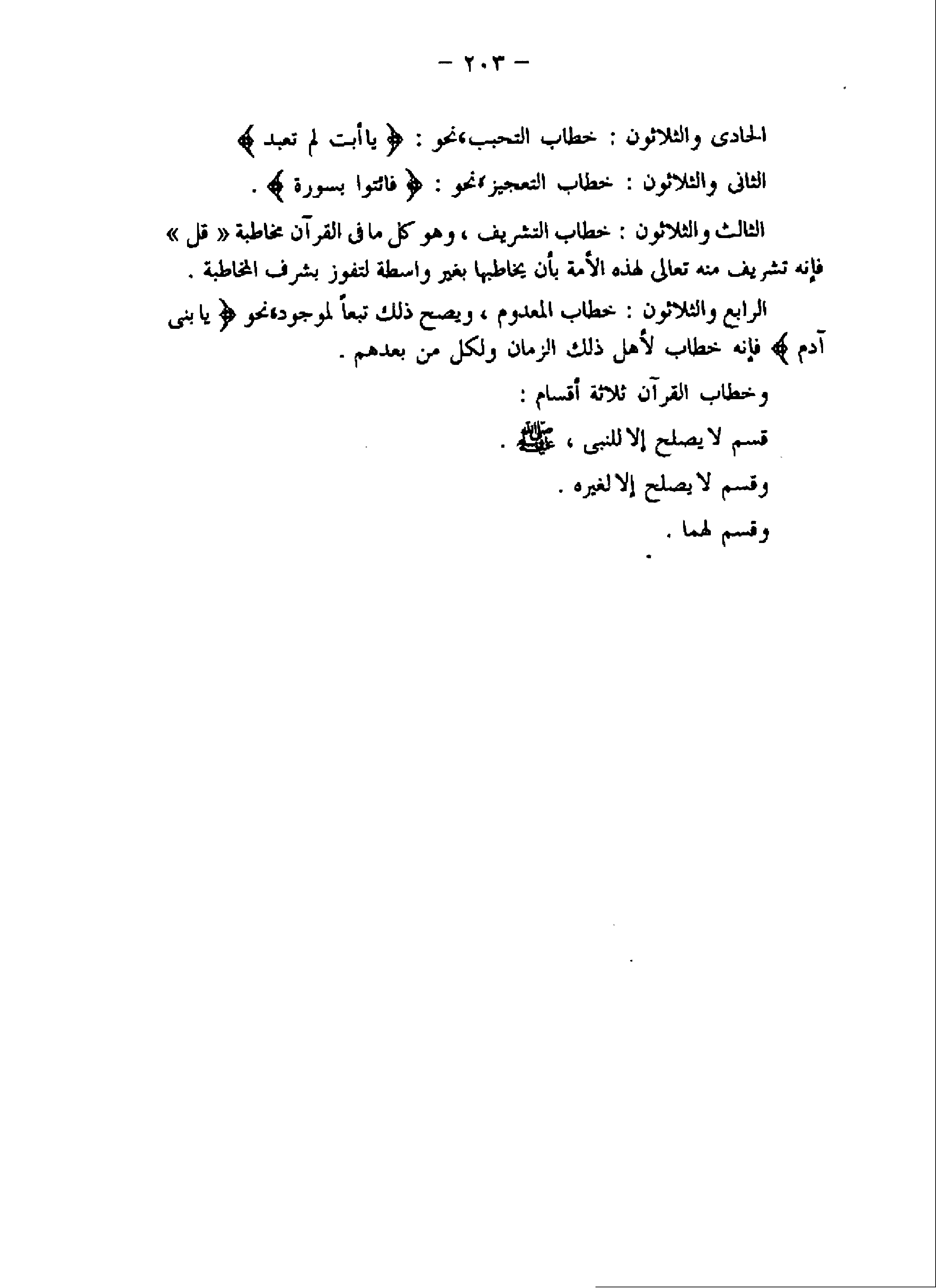 الرابع والثلاثون: خطاب المعدوم، ويصح ذلك تبعا لموجود، نحو يا بَنِي آدَمَ فإنه خطاب لأهل ذلك الزمان ولكل من بعدهم.