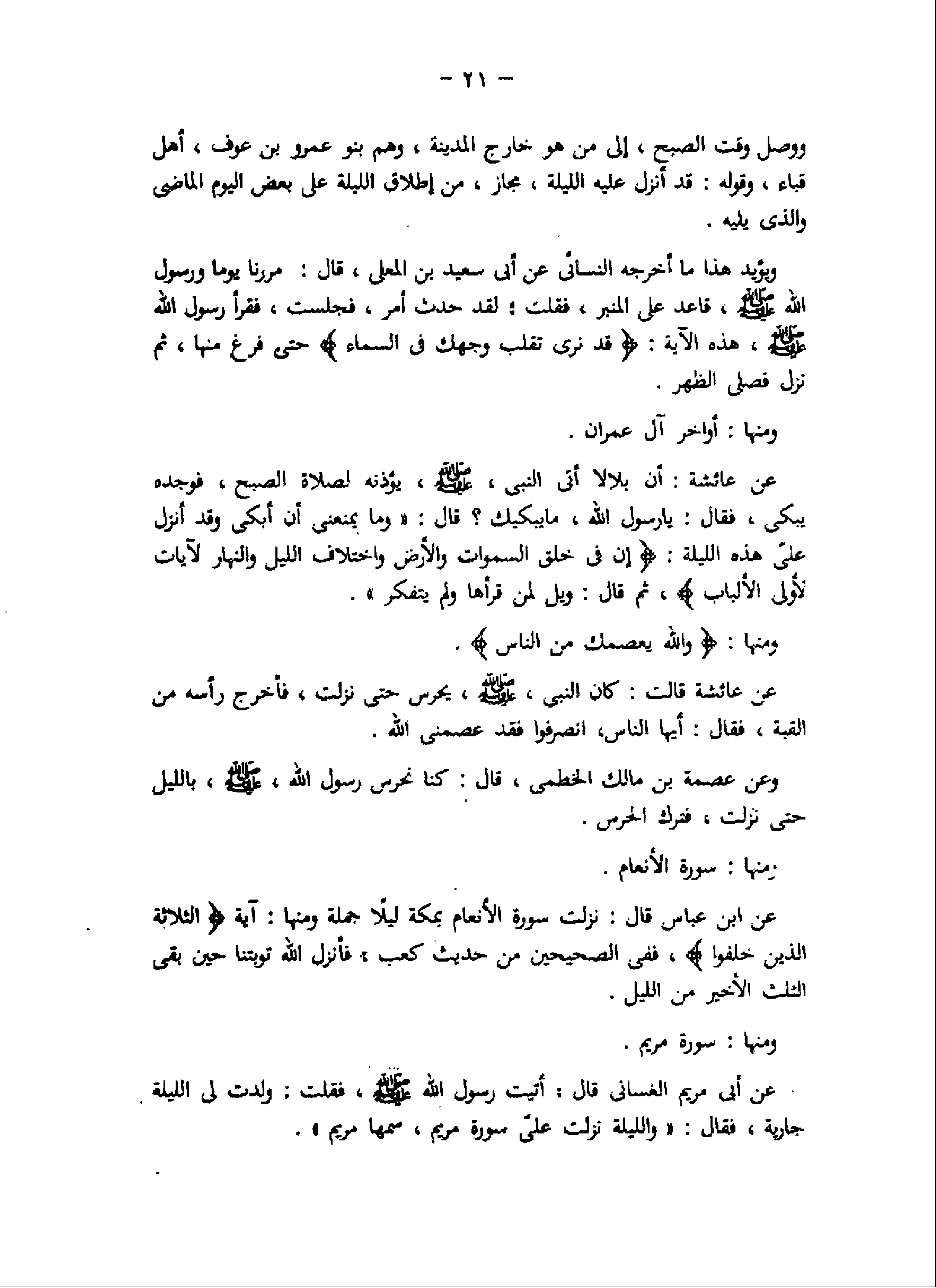 عن ابن عباس قال: نزلت سورة الأنعام بمكة ليلا جملة ومنها: آية الثَّلاثَةِ الَّذِينَ خُلِّفُوا، ففى الصحيحين من حديث كعب: فأنزل اللَّه توبتنا حين بقى الثلث الأخير من الليل.