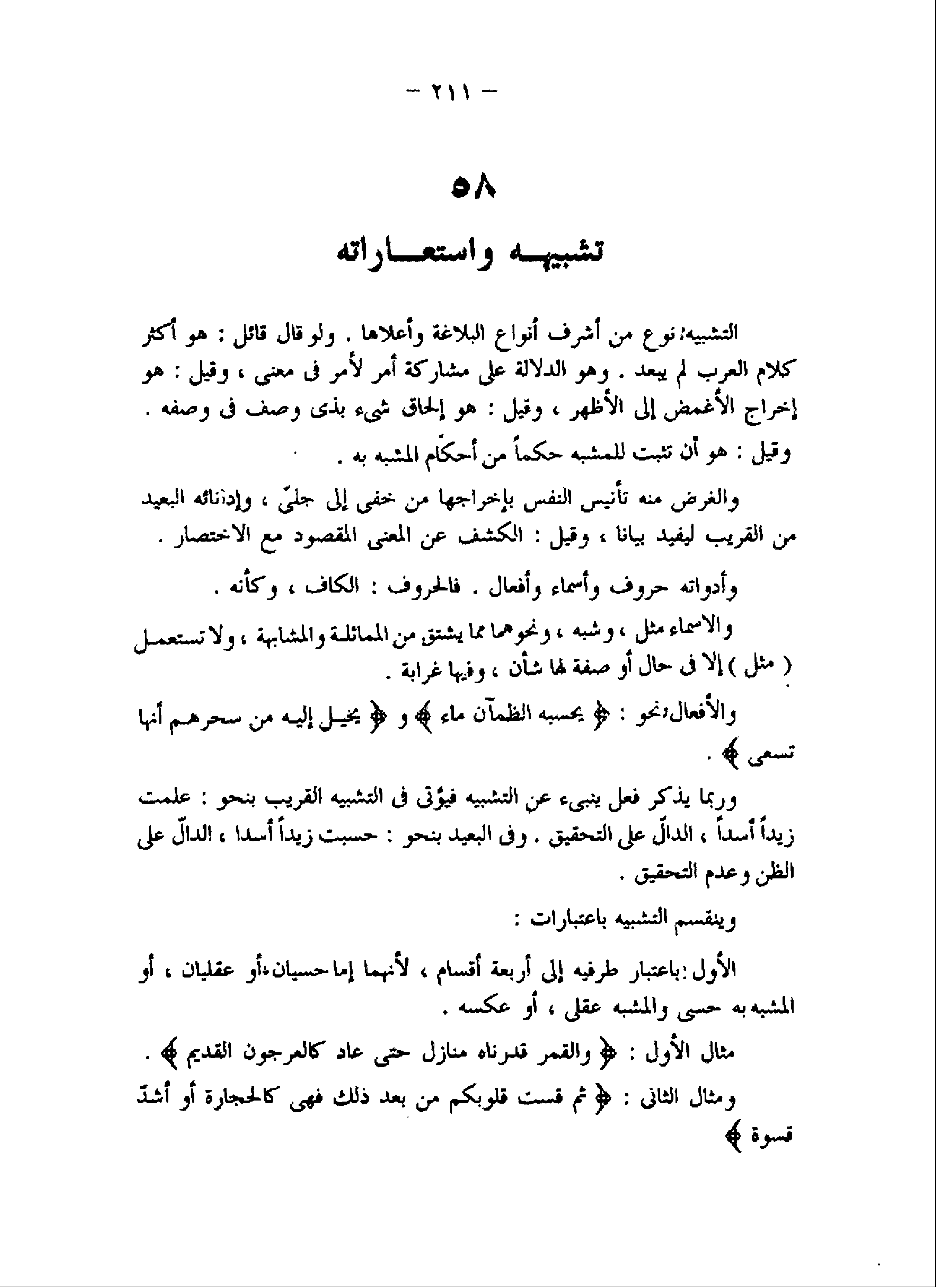 مثال الأول: وَالْقَمَرَ قَدَّرْناهُ مَنازِلَ حَتَّى عادَ كَالْعُرْجُونِ الْقَدِيمِ.