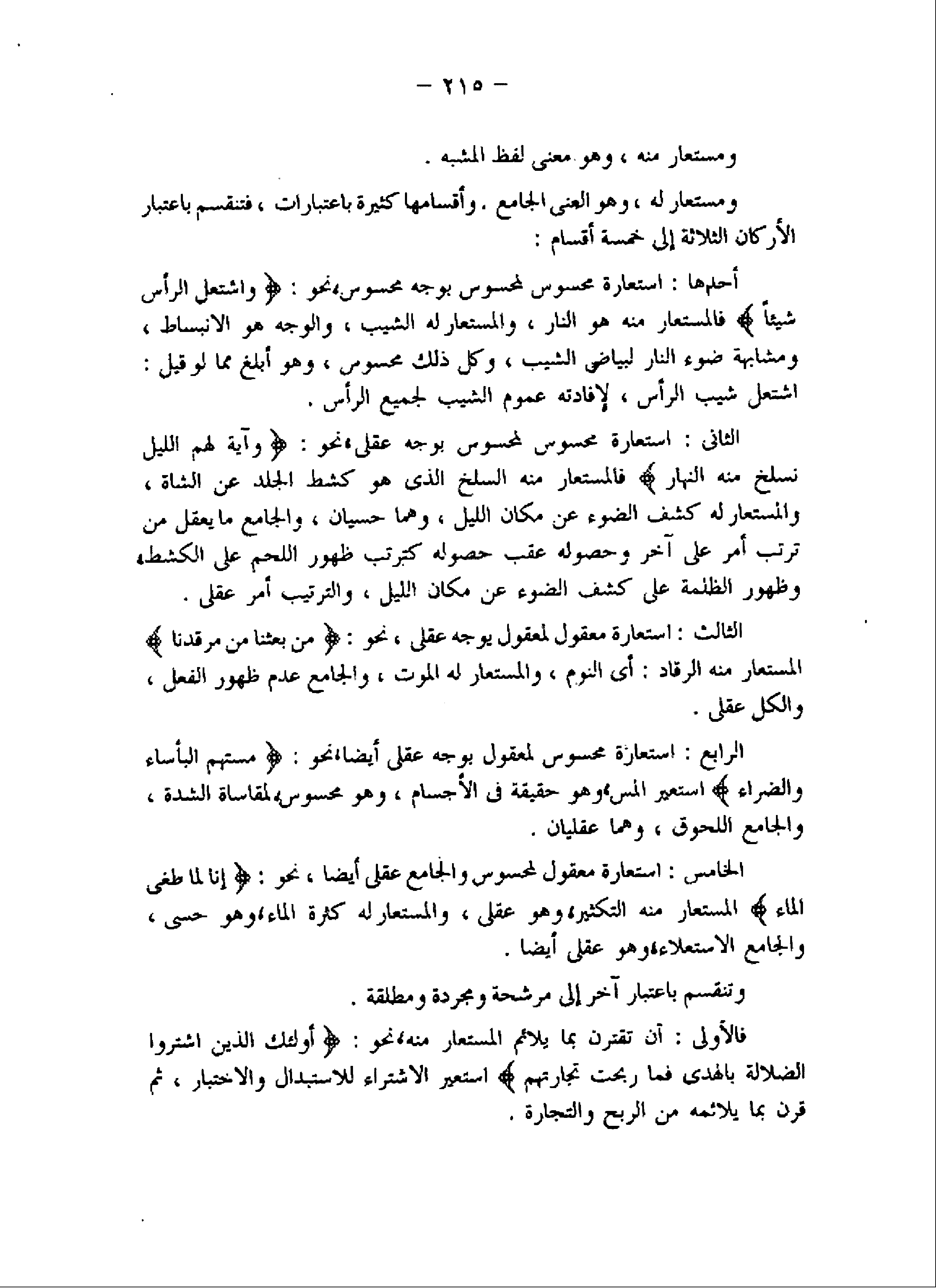 ومستعار له، وهو العنى الجامع. وأقسامها كثيرة باعتبارات، فتنقسم باعتبار الأركان الثلاثة إلى خمسة أقسام: