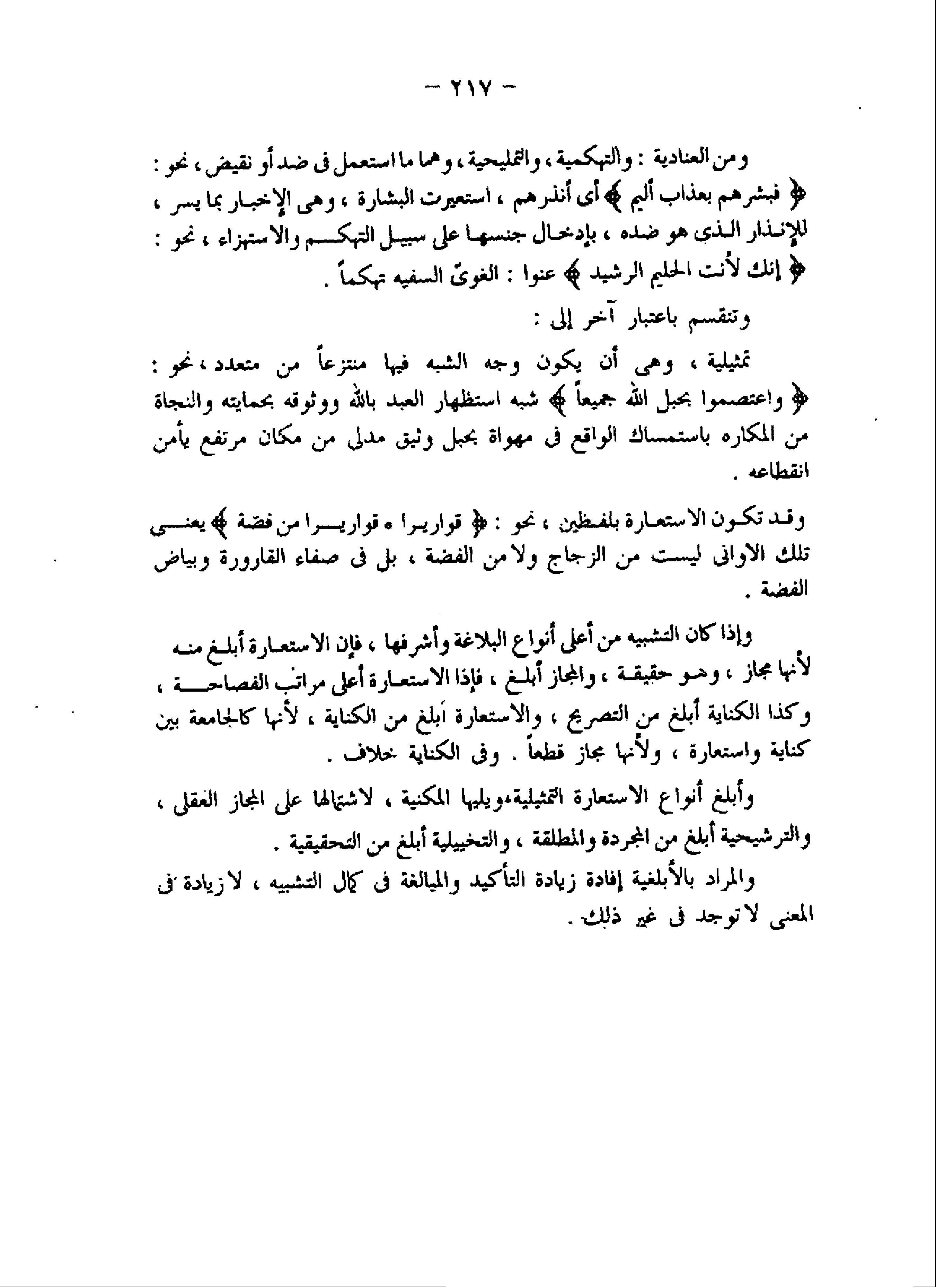 وأبلغ أنواع الاستعارة التمثيلية، ويليها المكنية، ولاشتمالها على المجاز العقلى، والترشيحية أبلغ من المجردة والمطلقة، والتخييلية أبلغ من التحقيقية.