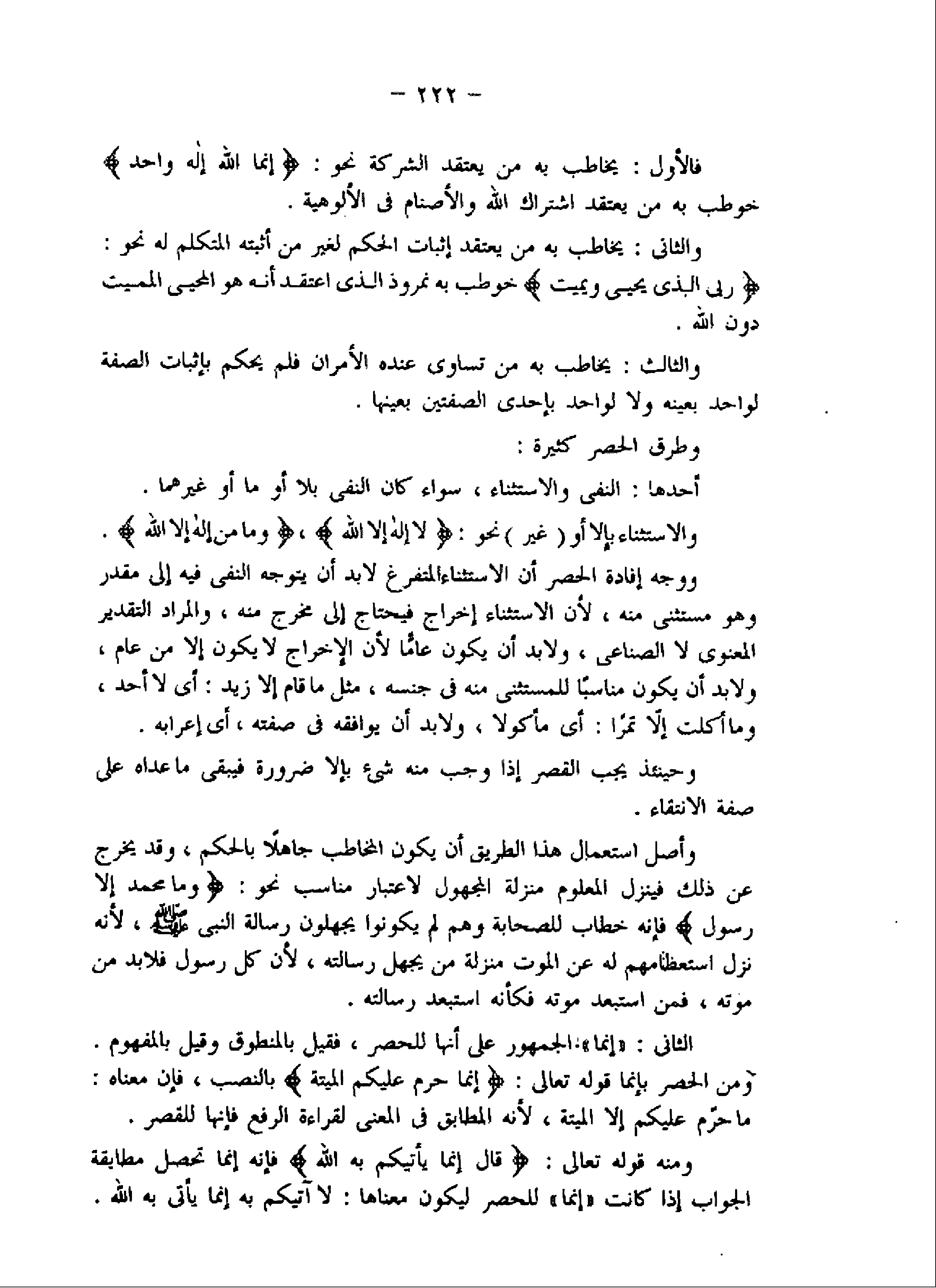فالأول: يخاطب به من يعتقد الشركة نحو: إِنَّمَا اللَّهُ إِلهٌ واحِدٌ خوطب به من يعتقد اشتراك اللَّه والأصنام فى الألوهية.