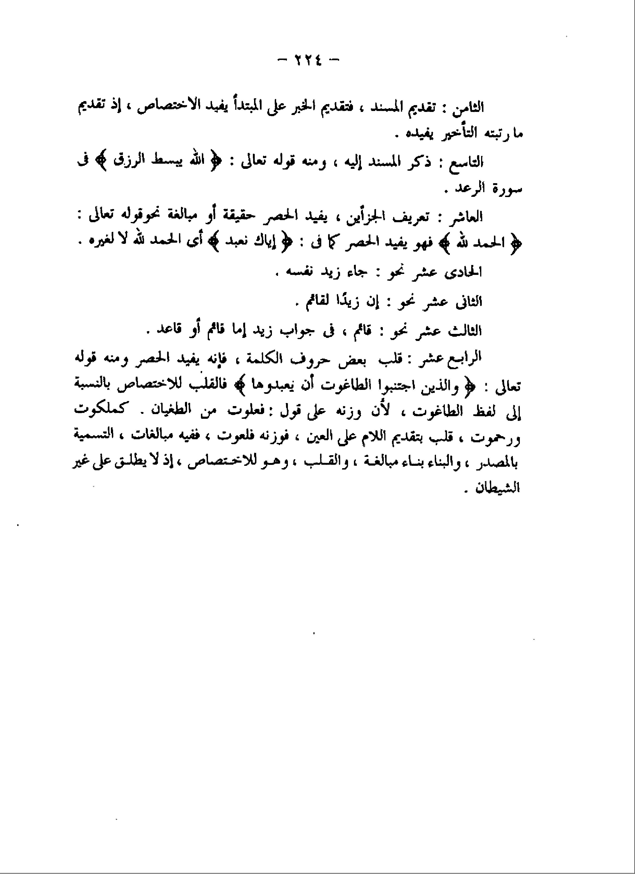 الرابع عشر: قلب بعض حروف الكلمة، فإنه يفيد الحصر ومنه قوله تعالى: وَالَّذِينَ اجْتَنَبُوا الطَّاغُوتَ أَنْ يَعْبُدُوها فالقلب للاختصاص بالنسبة إلى لفظ الطاغوت، لأن وزنه على قول: فعلوت من الطغيان. كملكوت ورحموت، قلب بتقديم اللام على العين، فوزنه فلعوت، ففيه مبالغات، التسمية بالمصدر، والبناء بناء مبالغة، والقلب، وهو للاختصاص، إذ لا يطلق على غير الشيطان.