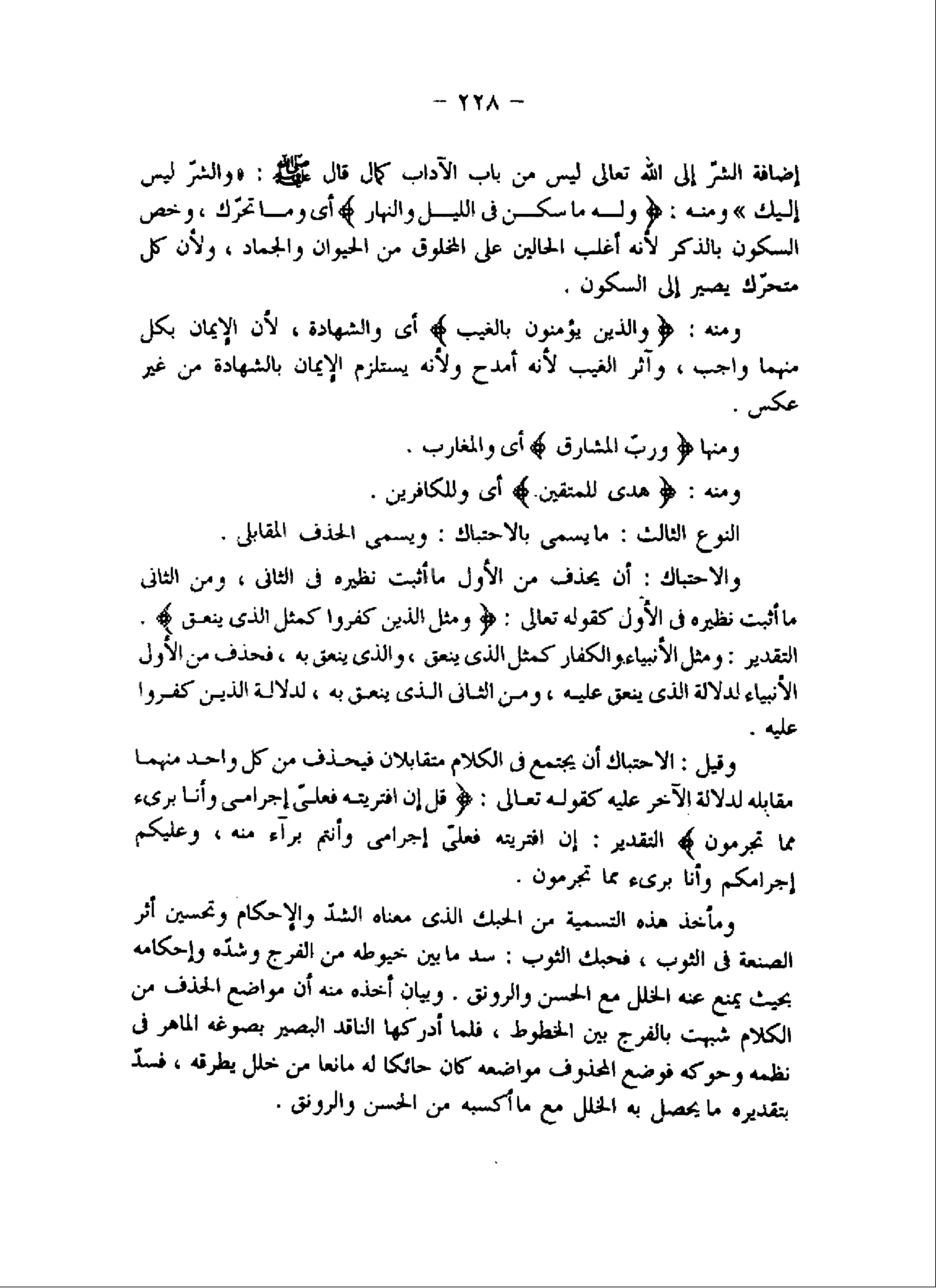 والاحتباك: أن يحذف من الأول ما أثبت نظيره في الثانى، ومن الثانى ما أثبت نظيره في الأول كقوله تعالى: وَمَثَلُ الَّذِينَ كَفَرُوا كَمَثَلِ الَّذِي يَنْعِقُ.