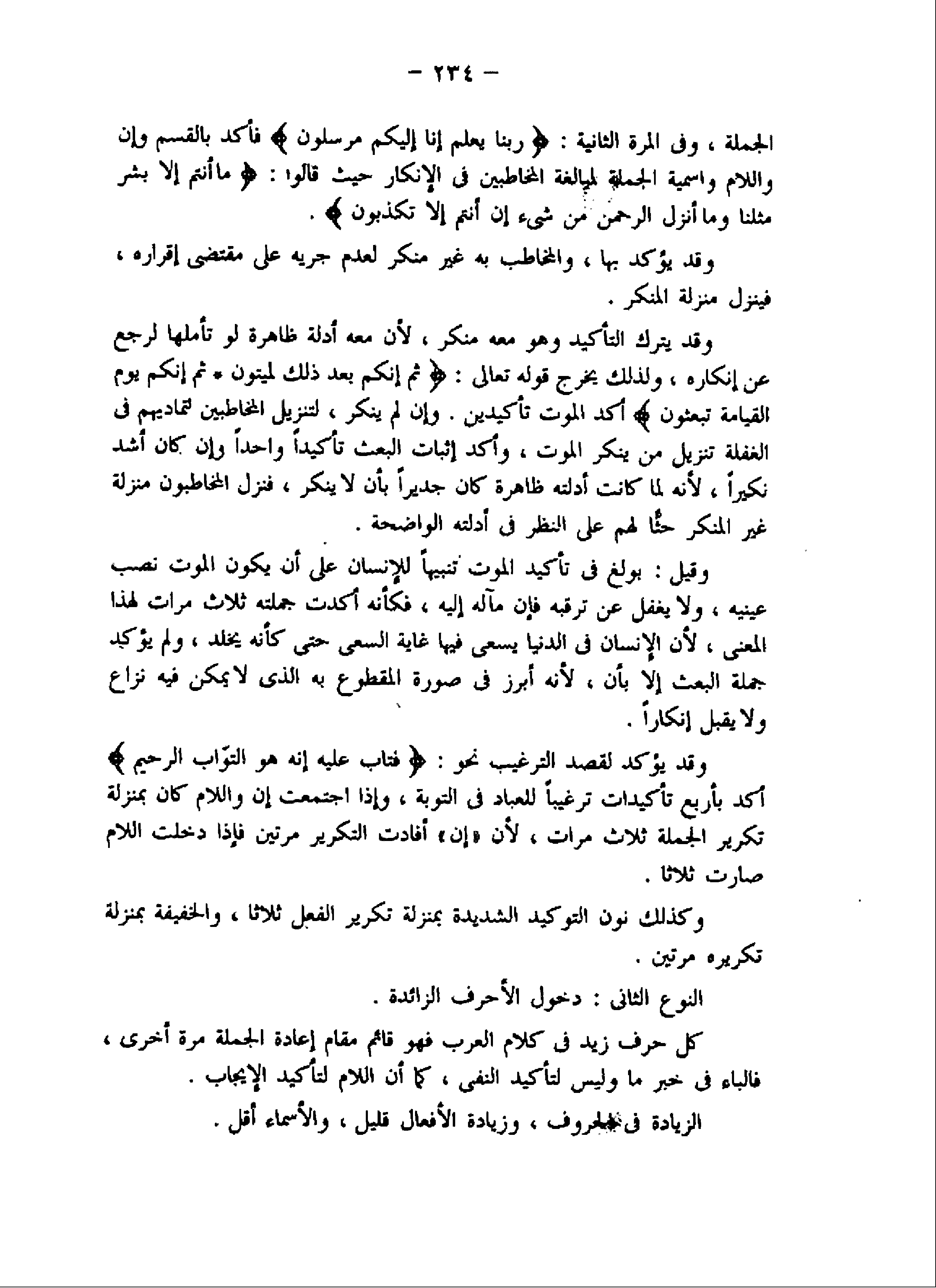 وقد يؤكد لقصد الترغيب نحو: فَتابَ عَلَيْهِ إِنَّهُ هُوَ التَّوَّابُ الرَّحِيمُ أكد بأربع تأكيدات ترغيبا للعباد في التوبة، وإذا اجتمعت إن واللام كان بمنزلة تكرير الجملة ثلاث مرات، لأن «إن» أفادت التكرير مرتين فإذا دخلت اللام صارت ثلاثا.