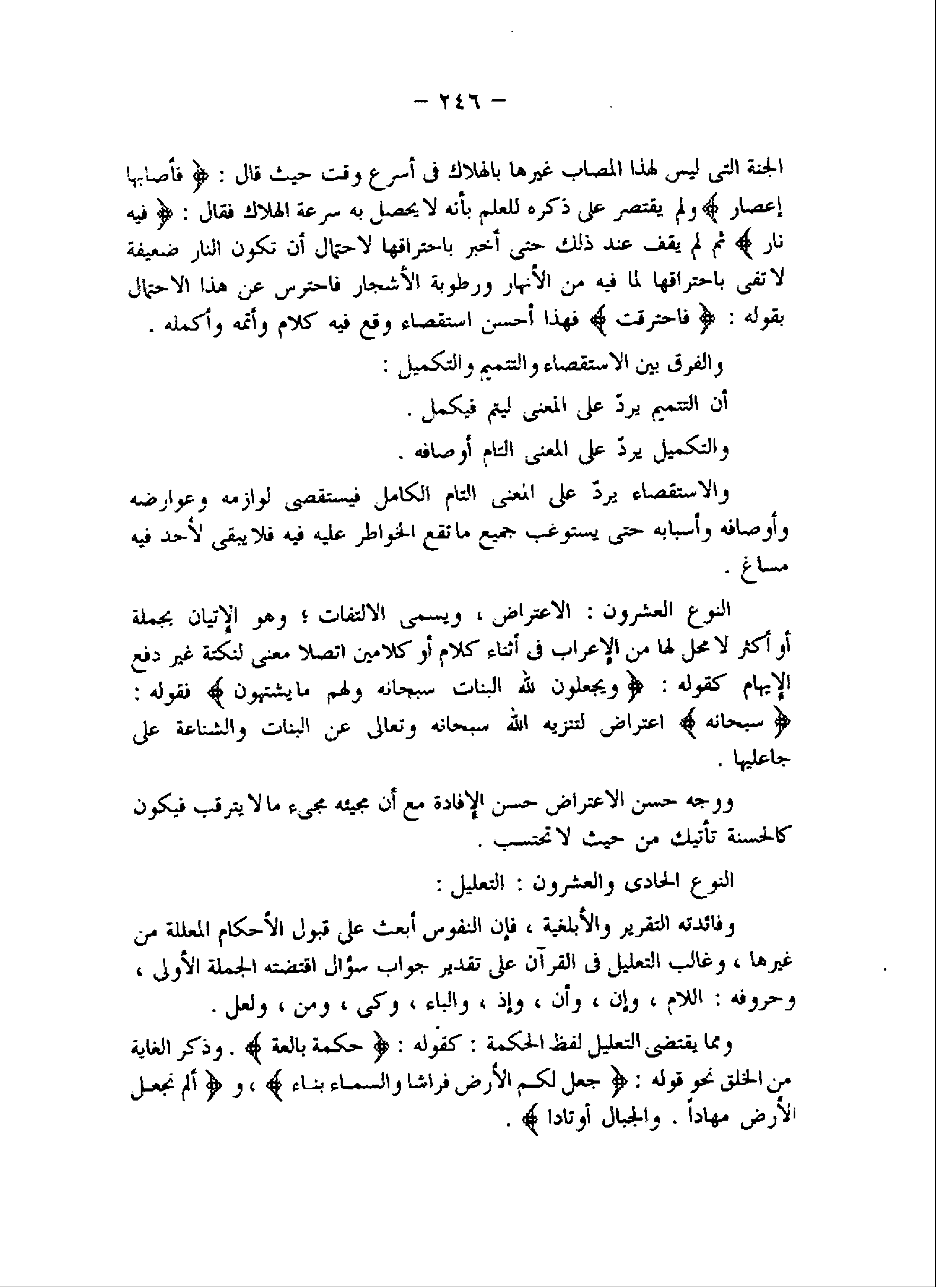 الجنة التى ليس لهذا المصاب غيرها بالهلاك فى أسرع وقت حيث قال: فَأَصابَها إِعْصارٌ ولم يقتصر على ذكره للعلم بأنه لا يحصل به سرعة الهلاك فقال: فِيهِ نارٌ ثم لم يقف عند ذلك حتى أخبر باحتراقها لاحتمال أن تكون النار ضعيفة لا تفى باحتراقها لما فيه من الأنهار ورطوبة الأشجار فاحترس عن هذا الاحتمال بقوله: فَاحْتَرَقَتْ فهذا أحسن استقصاء وقع فيه كلام وأتمه وأكمله.